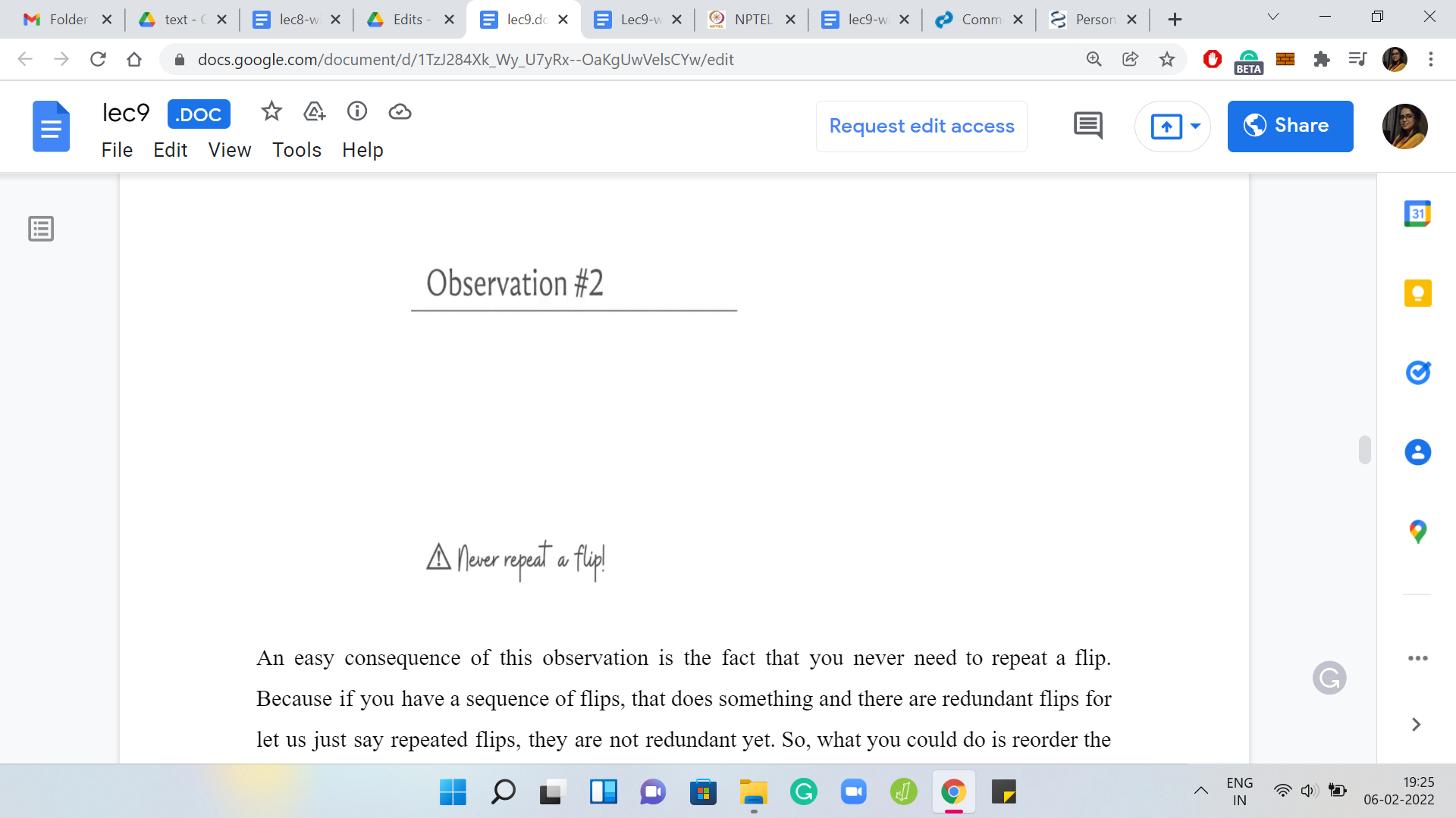 An easy consequence of this observation is the fact that you never need to repeat a flip. Because if you have a sequence of flips, that does something and there are redundant flips or let us just say repeated flips, they are not redundant yet. What you could do is reorder the flip so that all the repeated ones come one after the other. Now notice that all these repeated flips are not really doing any valuable work for you.