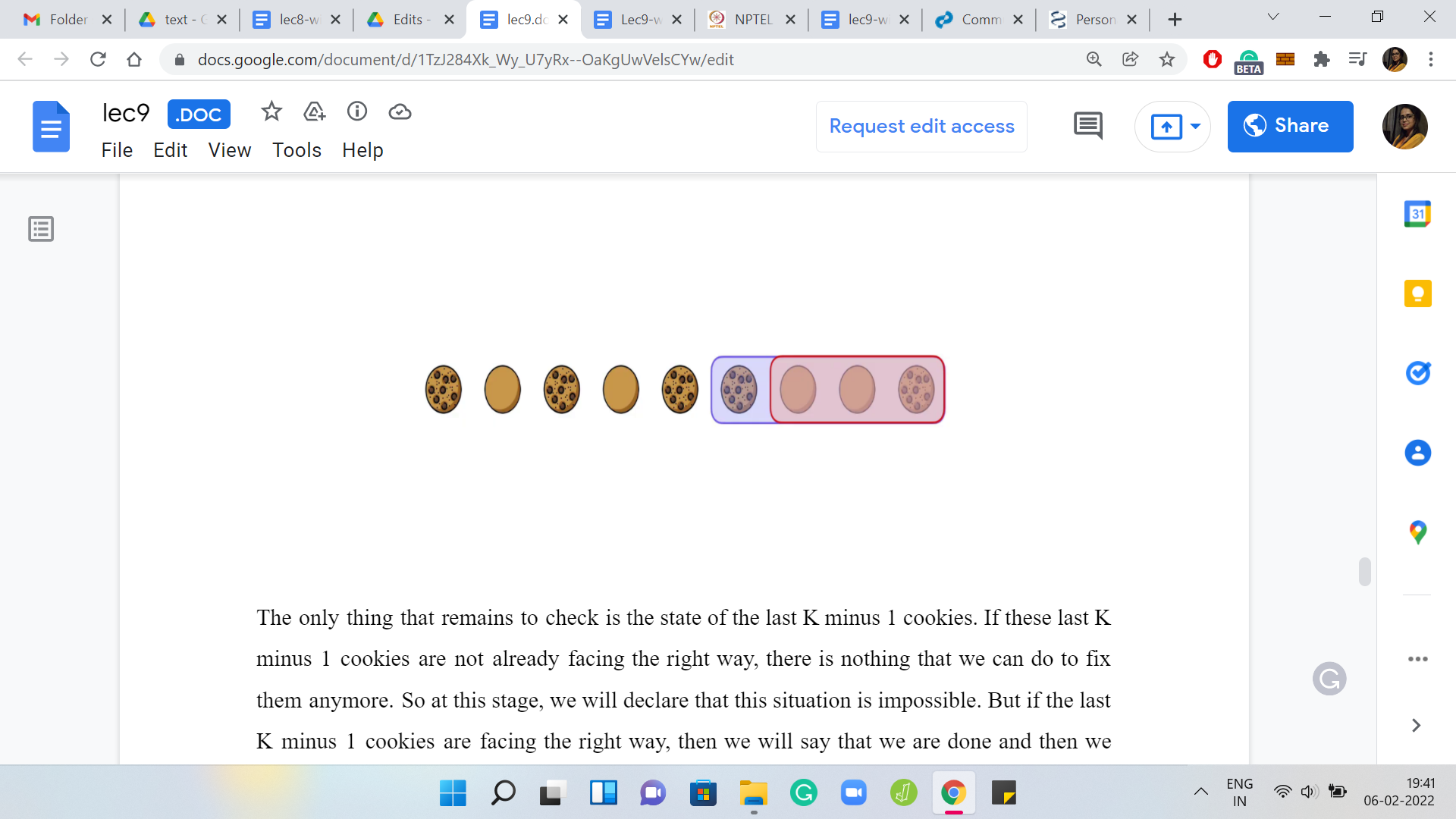 The only thing that remains to check is the state of the last ‘K-1’ cookies. If these last ‘K-1’ cookies are not already facing the right way, there is nothing that we can do to fix them anymore. At this stage, we will declare that this situation is impossible. But if the last ‘K-1’ cookies are facing the right way, then we will say that we are done and we will report the number of flips that we have made.