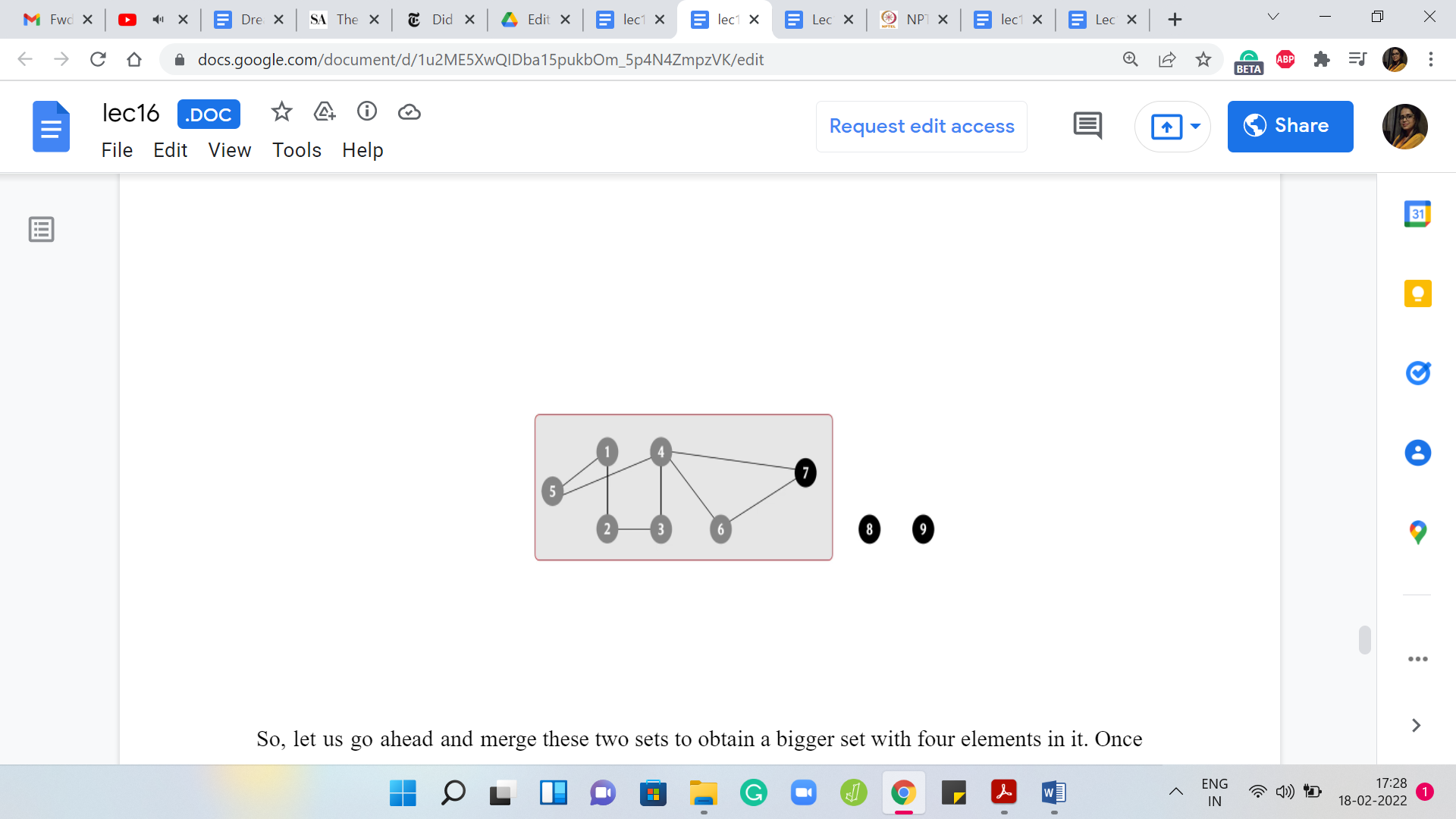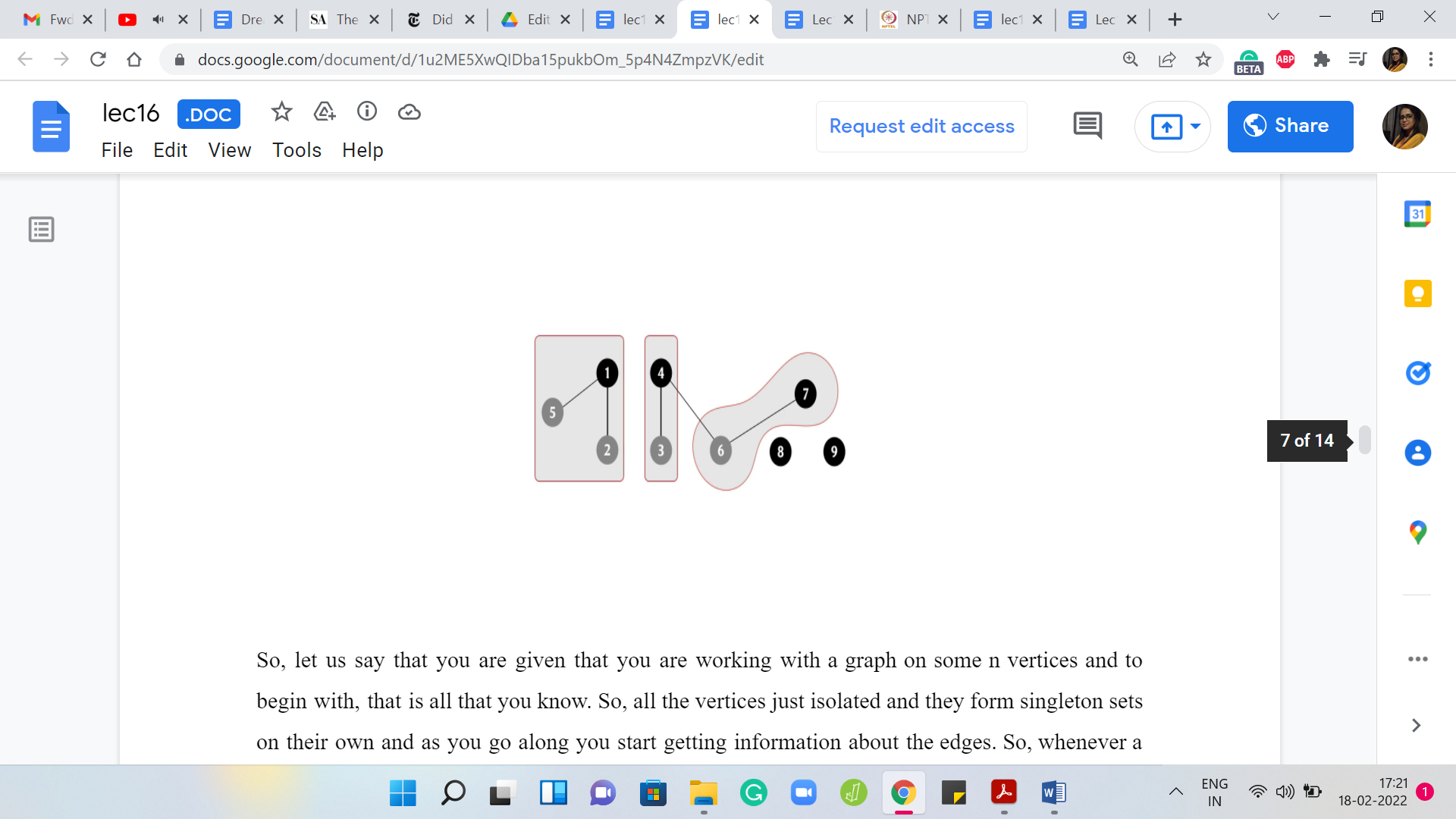 Let us say that you are given that you are working with a graph on some ‘n’ vertices, and to begin with, that is all that you know. All the vertices are just isolated and they form singleton sets on their own right and as you go along, you start getting information about the edges. Whenever a new edge is added to the graph, what you want to do is take the union of the connected components that the endpoints of the edge belong to.