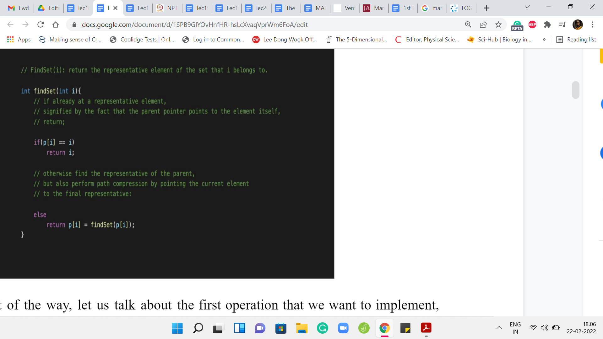 So, that is what is happening here when we say p[i] = findSet(p[i]). So, that is finding the root and reassigning the parent of ‘i’ all at the same time. This is also what we are going to return. All of this is combined in this succinct one-liner. You could write this down a little more explicitly. But this works out just the same.