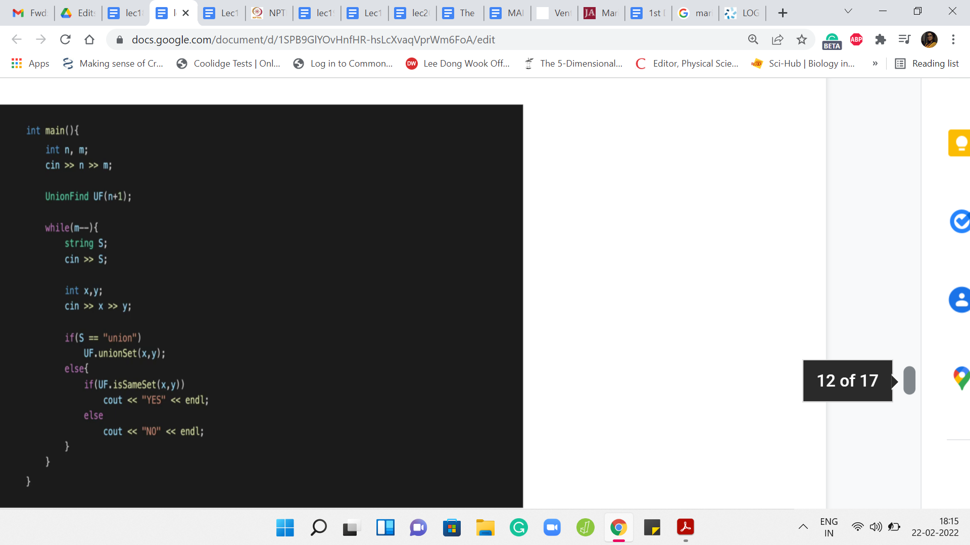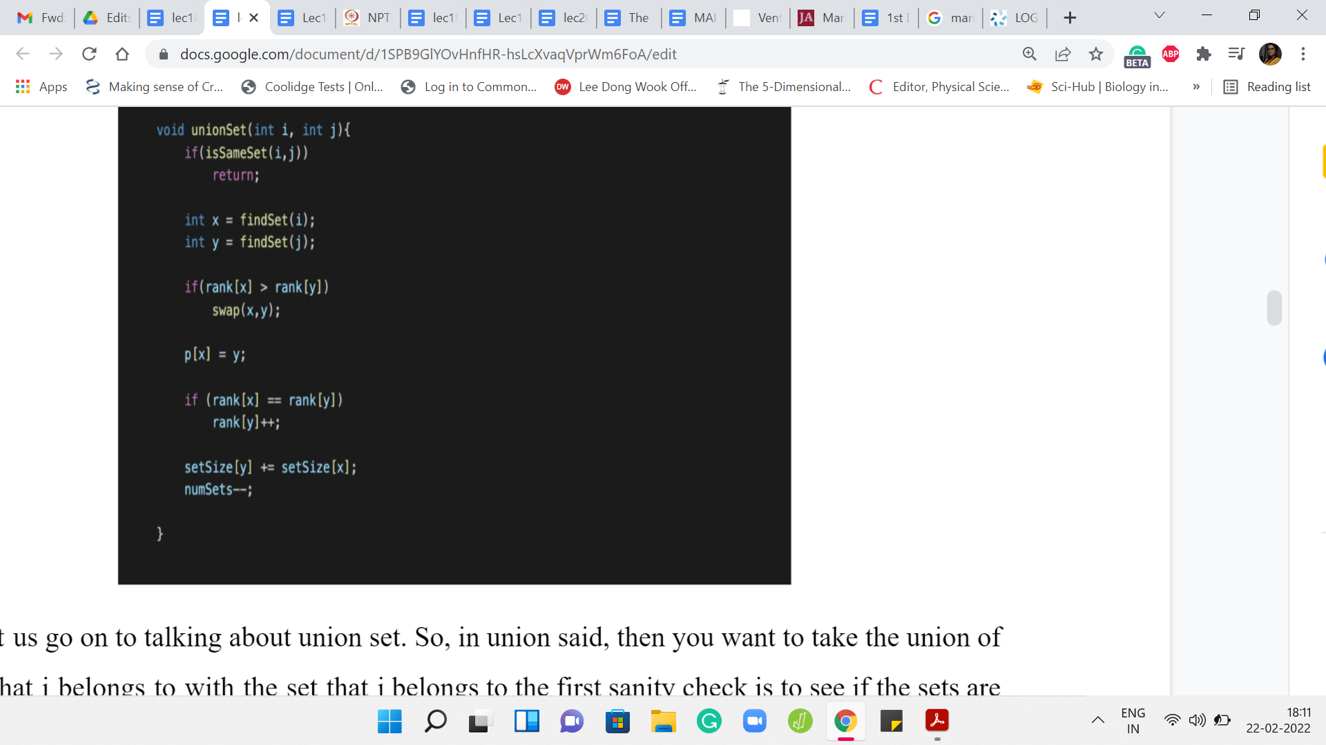 If you recall, we discussed a couple of different heuristics. First, we talked about ‘union by depth,’ and then we talked about ‘path compression’ and ‘union by rank.’ Basically, that is what we are going to implement and the specific implementation here is in C++ but it is quite easily adaptable to Python or any other language of your choice. The implementation here is really elegant and simple and it follows the pseudocode quite closely. I think we will have some fun.