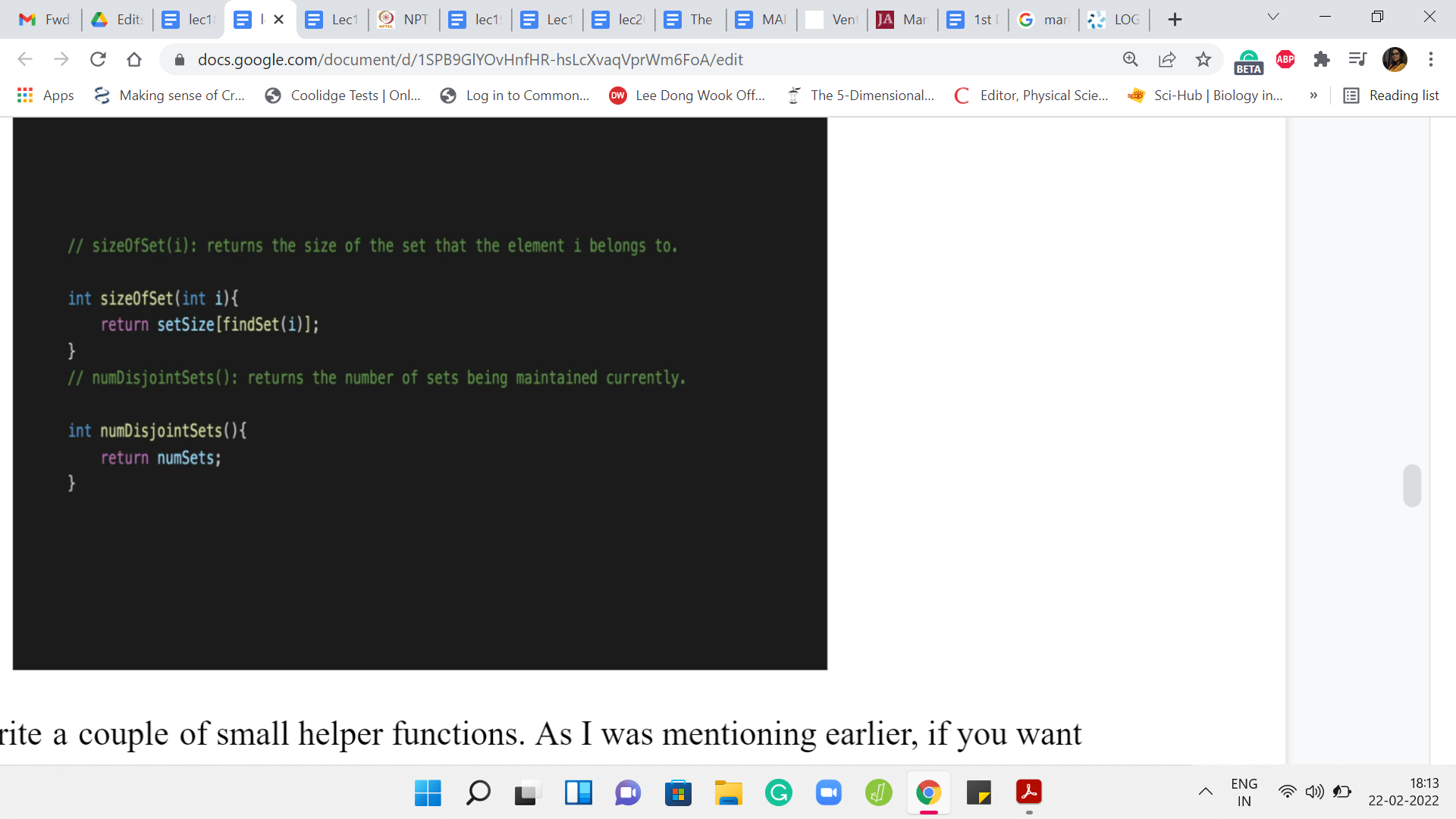 Let us just write a couple of small helper functions. As I was mentioning earlier, if you want to find the size of a particular set, you do not just return the value in the set size array. But you actually go to the set size array as indexed by the leader element of the set that ‘i’ belongs to. So, you do the findSet of ‘i,’ and you do the set size of that element. That is what you return. If you wanted to know how many sets are right, now you can simply return numSets. These are two useful helper functions to have.