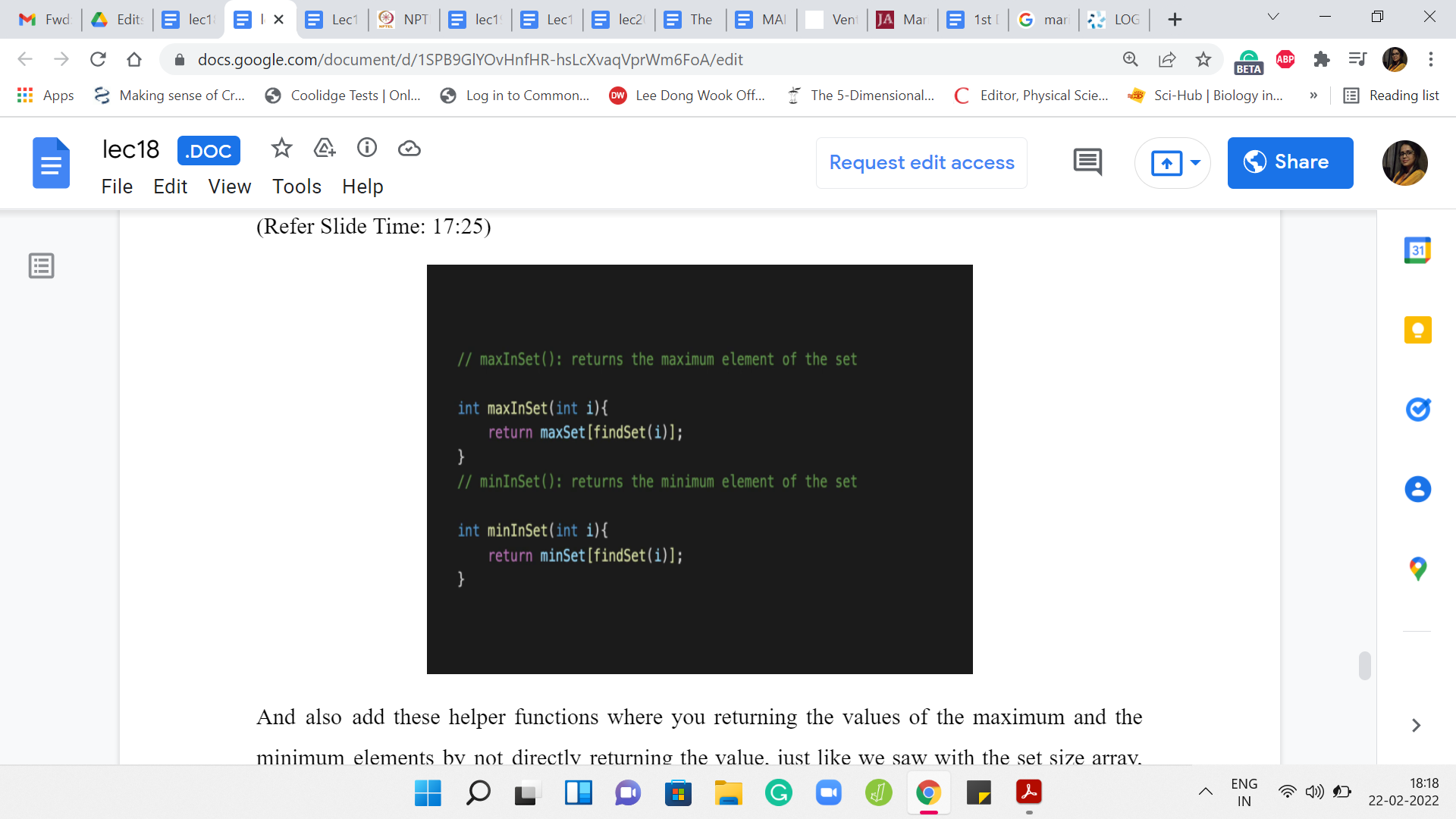 To find out the maximum value in the set that contains the element ‘i,’ first find the representative element of the set that contains ‘i’ and then look up maxSet for that element and this is analogous for minSet. We have these two very simple helper functions, which will give us the values that we want. You can invoke them when you are writing down your output and the main function.