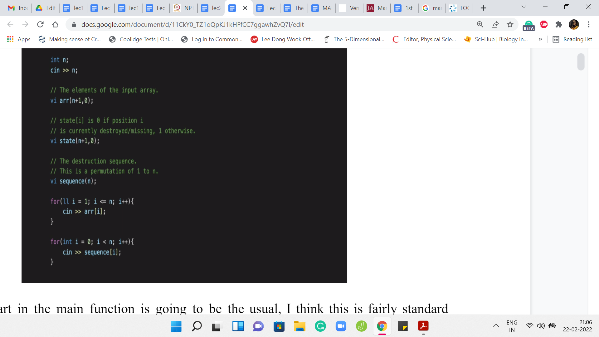 The state vector will evolve as we go through the process of adding elements to the array one by one. Then we declare, again, the vector of integers to take in the sequence in which the destruction happens. We just take in all of these inputs. Let me just also point out the limits. I believe the value of ‘n’ ranges from 1 to 100,000. The values of the elements in the array would range between 1 and 109.