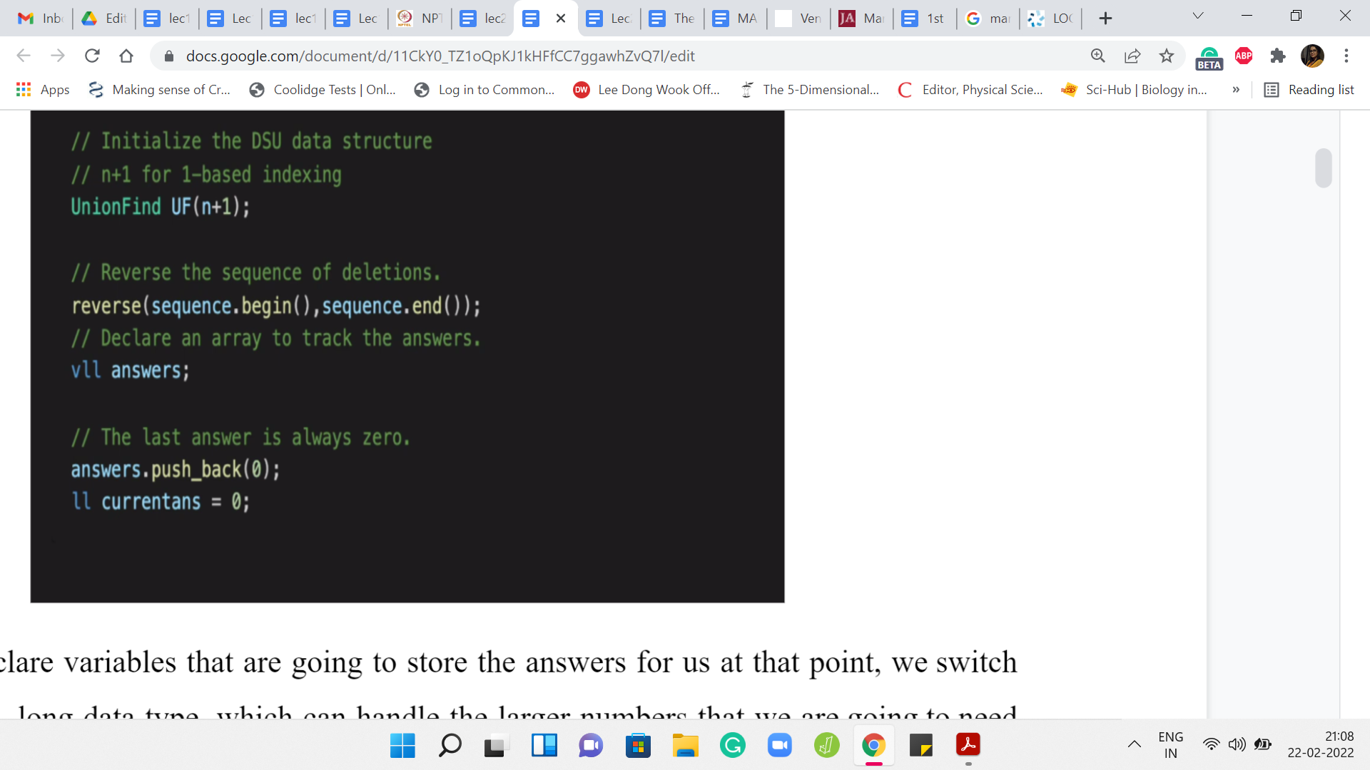 When we declare variables that are going to store the answers for us, at that point, we switch over to the long, long data type, which can handle the larger numbers that we are going to need as we go along. After taking in all of the input, we instantiate the disjoint set union data structure. Again, I do this with ‘n+1’ elements so that I can simply talk about the ’i’th element without having to adjust for indexing to go back and forth between zero-based and one-based indexing. You might have a different taste with regards to this.