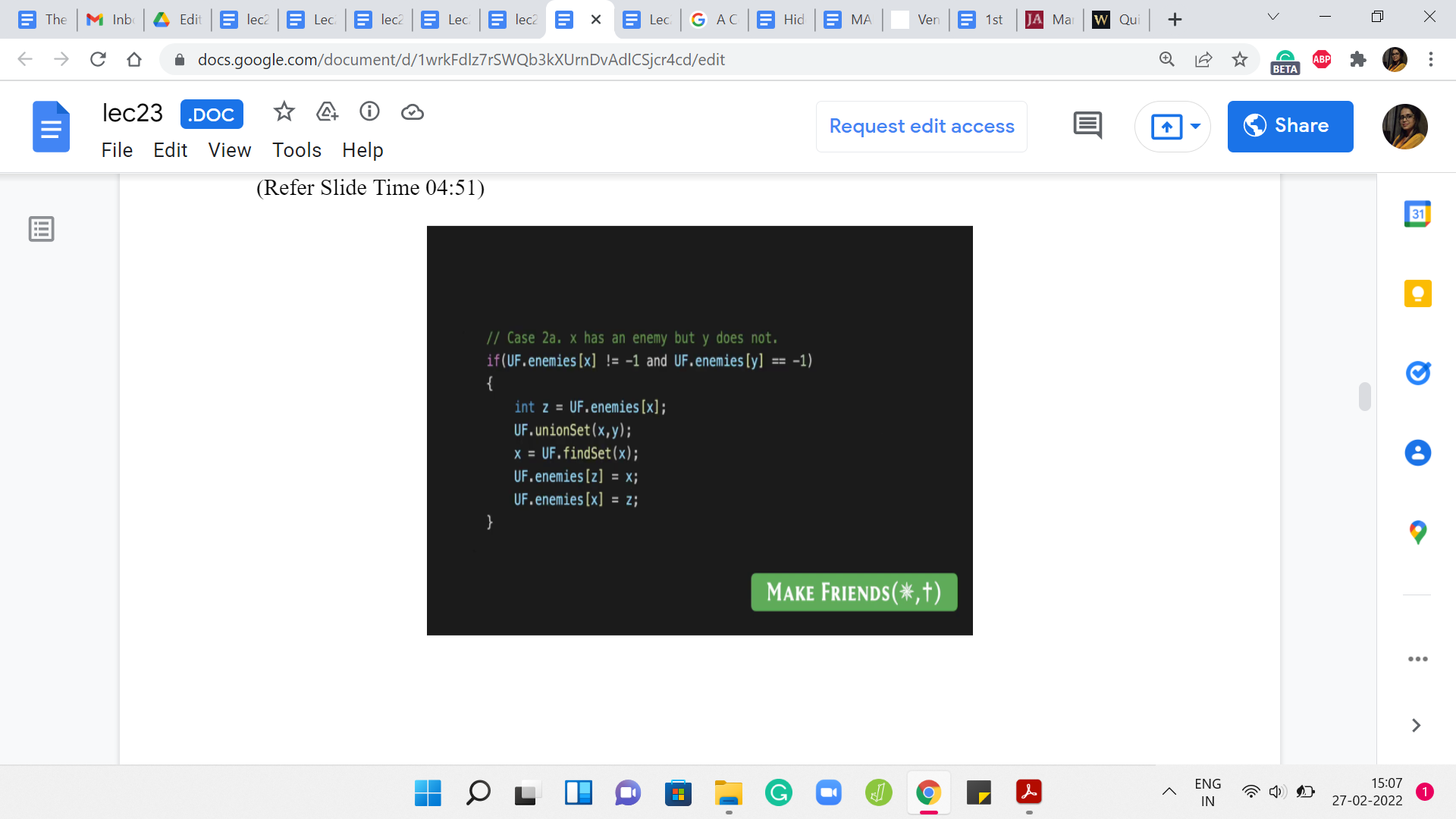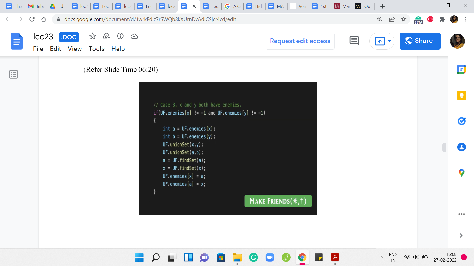 I am just going to begin by looking at what the unionFind class looks like. We have just essentially introduced a public entity called ‘enemies.’ This is to keep track of the enemy pointers on the leader elements. The rank and friends are the usual things from the default DSU data structure. So, ‘friends’ is just a renaming of the parent array. I think we have been using P to denote the patent pointers previously.