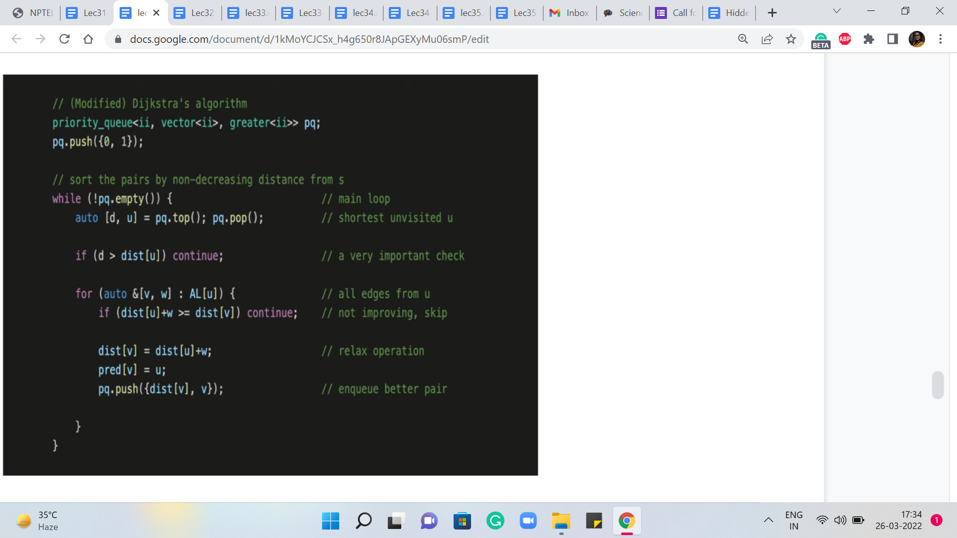 If the value from the priority queue is higher than the value that we have in the distance array, then we know that this is a stale, old value and this just needs to be rejected from consideration. So let us just look at how this version works in code.
