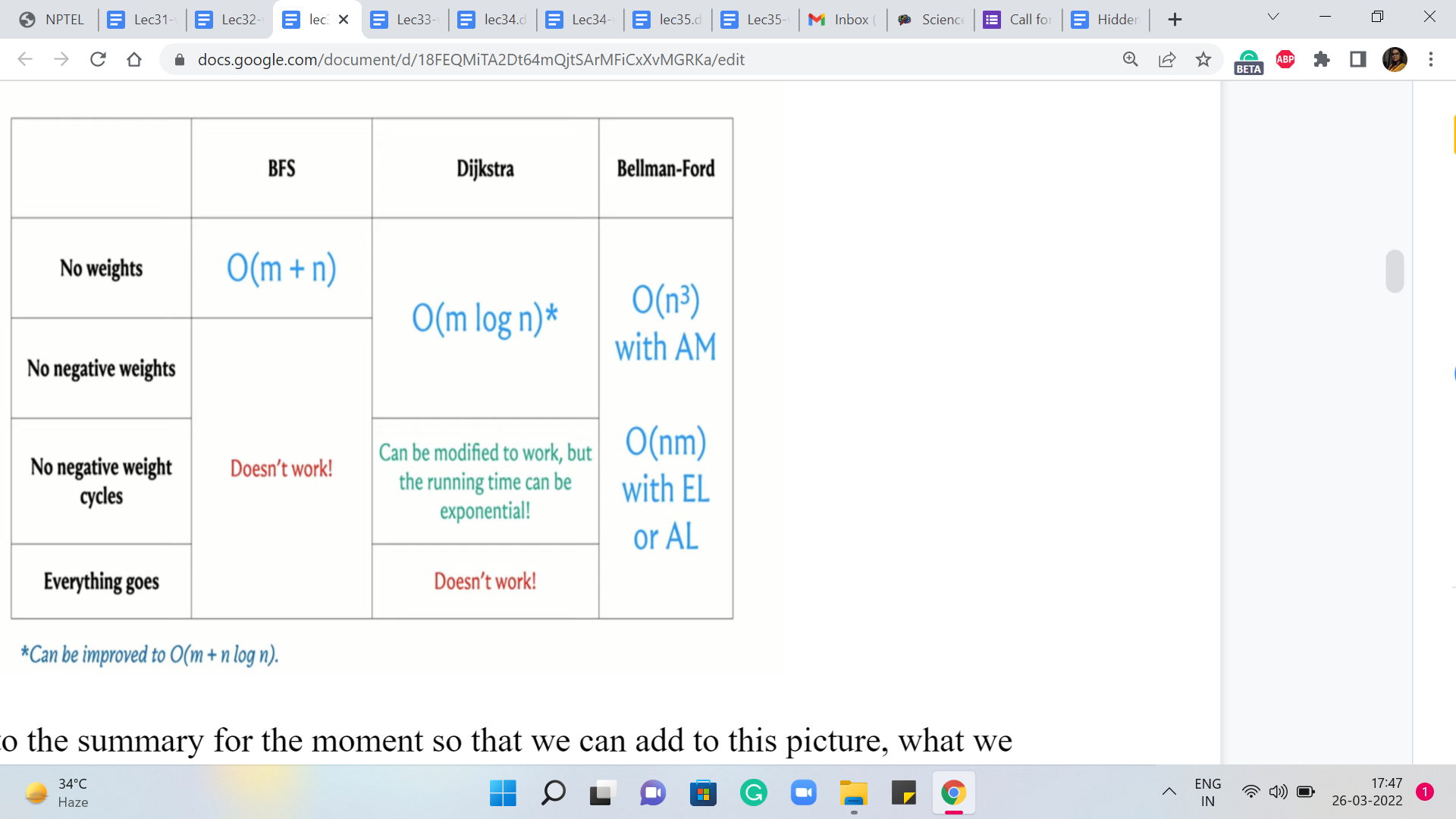 So just going back to the summary for the moment so that we can add to this picture: What we are going to look at now is the Bellman-Ford algorithm, which has a running time that is either order ‘n’ cubed or order ‘n’ * ‘m,’ depending on whether we model the graph is adjacency matrices, or adjacency lists, respectively. And this will algorithm will turn out to do exactly what we want, which is to say that it can identify negative cycles when they are present and compute shortest paths and absent.