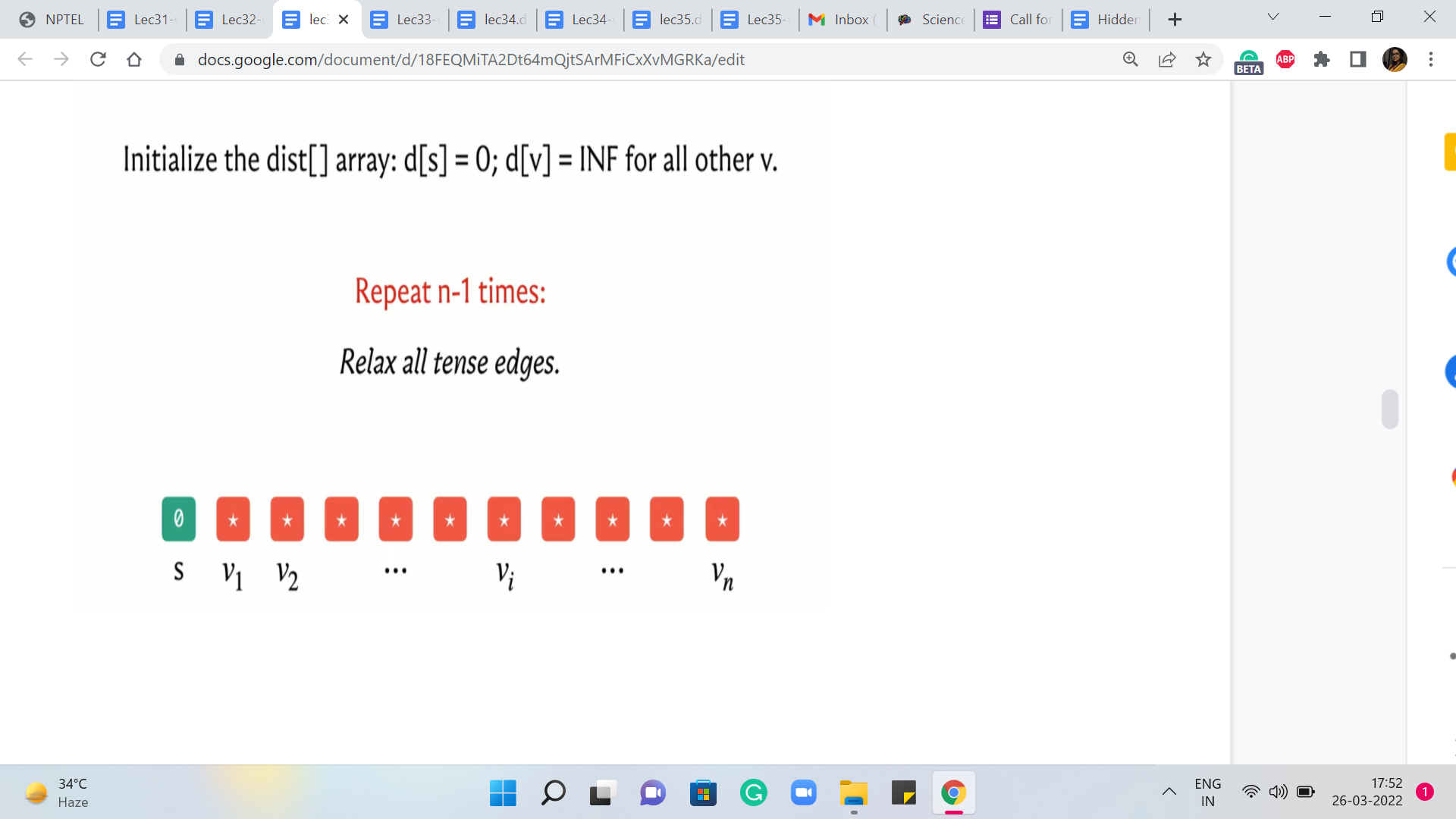 So the distance of v, the d array is going to reflect this new value, d + w. Now we have performed this kind of relaxation operation several times in the context of Dijkstra’s algorithm. Now let us take a look at how Bellman-Ford is going to perform these relaxations.