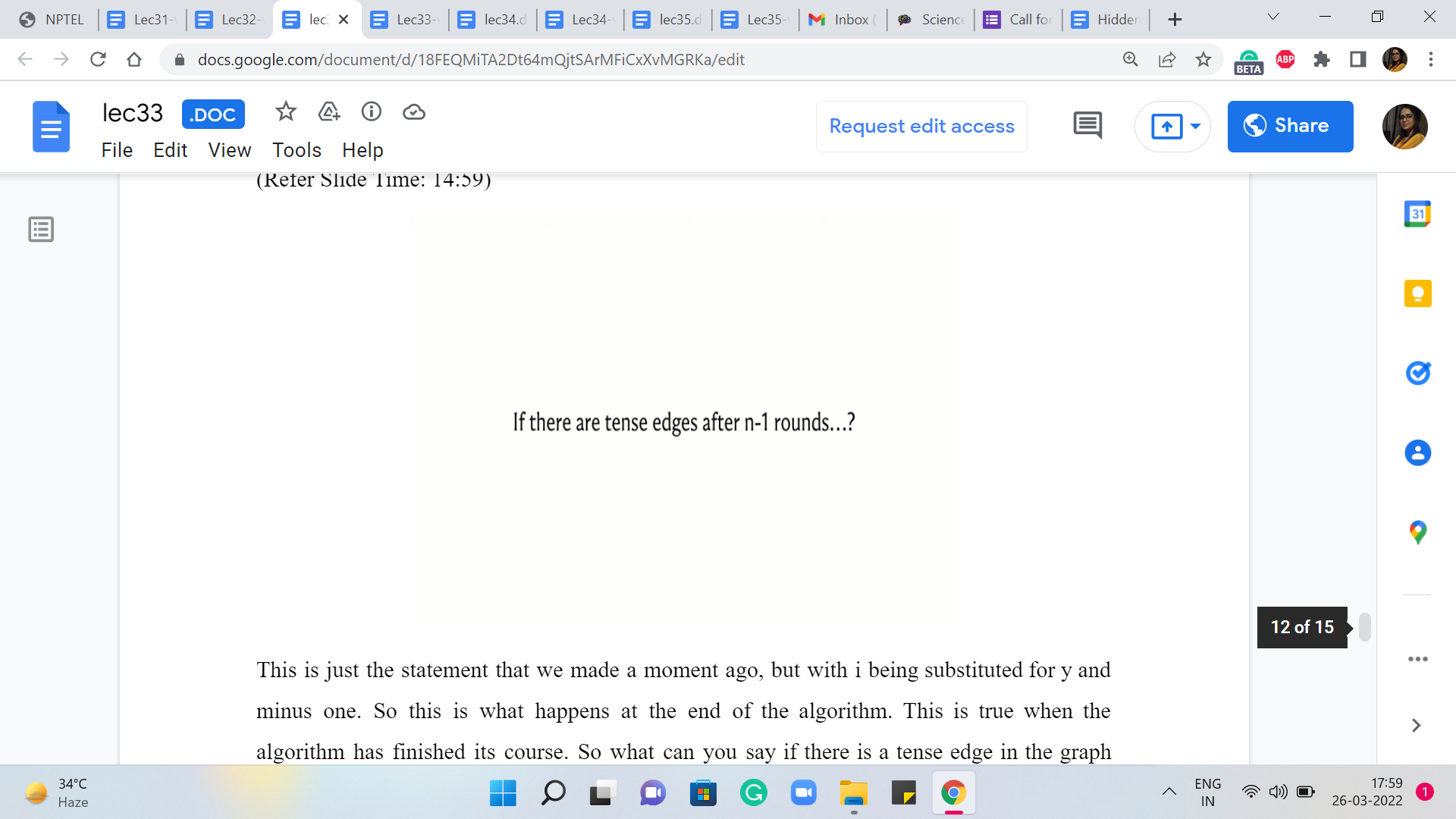 This is just the statement that we made a moment ago, but with ‘i’ being substituted for by ‘n-1.’ So this is what happens at the end of the algorithm. This is true when the algorithm has finished its course. So what can you say if there is a tense edge in the graph after all the ‘n-1’ rounds of Bellman-Ford have run their course, and have completed their work? What can you say if there is a tense edge after all of this?