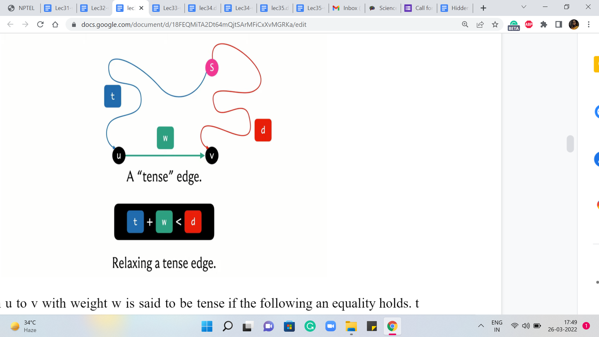 So an edge from ‘u’ to ‘v’ with weight ‘w’ is said to be tense if the following inequality holds: ‘t’ + ‘w’ < ‘d,’ where t and d are our current understanding of the distances of the vertices u and v, respectively, from the source. So t can be thought of as the value of d of ‘v,’ if d is the distance array. And d can be thought of as the value of d[v], again, d being the same distance array.