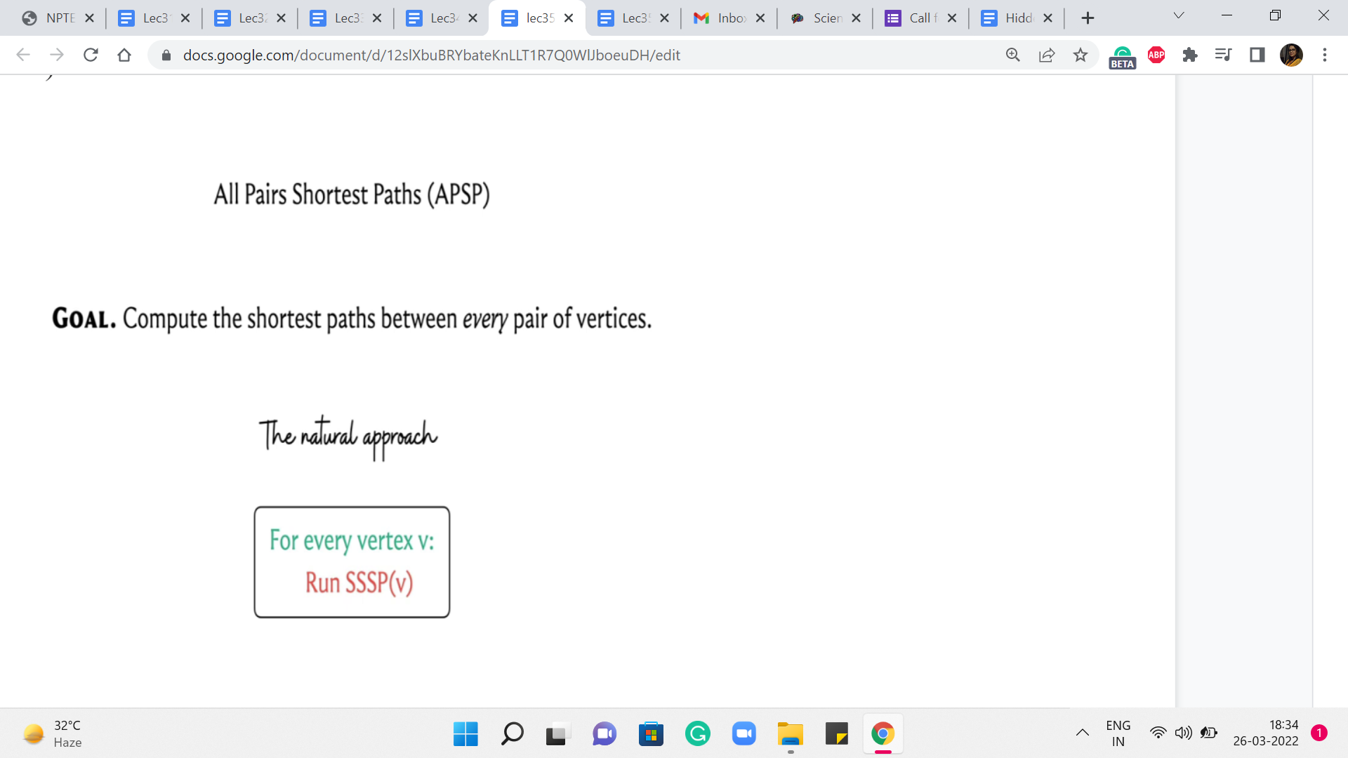 So, let us get started with the problem itself. So, we are trying to tackle all-pairs shortest paths. As usual, will assume that we are working with a directed and a weighted graph. And our goal, in this case, is to compute the shortest paths between every pair of vertices. Now, having worked so much on SSSP, which is ‘single-source shortest path,’ I think a very natural reaction is to say, well, what is the big deal? We just run SSSP from every vertex, and this way, we will end up calculating the length of the shortest paths between any pair of vertices. And that would be absolutely correct. Let us take a look at the SSSP algorithms that we have seen so far.