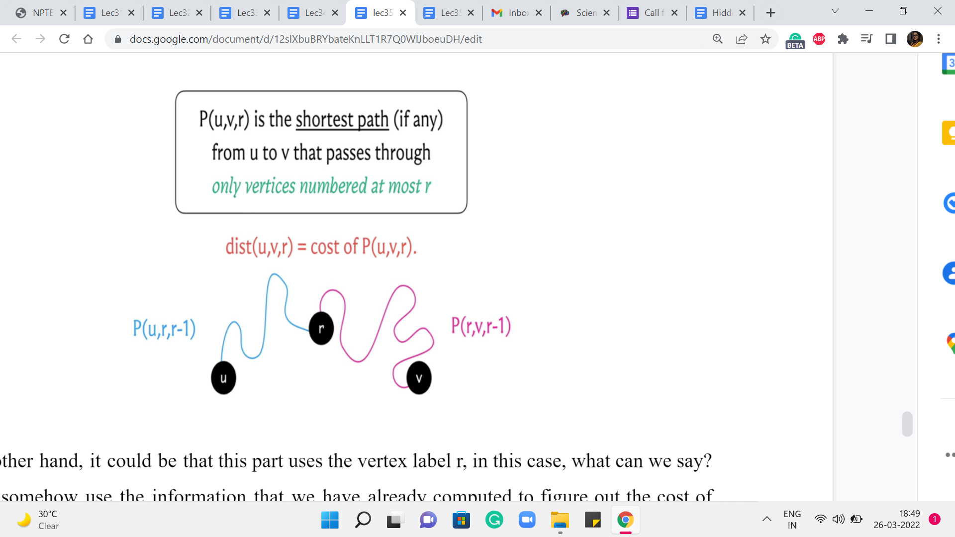 On the other hand, it could be that this part uses the vertex label r. In this case, what can we say? Can we somehow use the information that we have already computed to figure out the cost of this path? Remember that the vertex r has already been used. So, the question is what can we say about the paths that go from u to r and from r to v. Just think about breaking it down in that way.