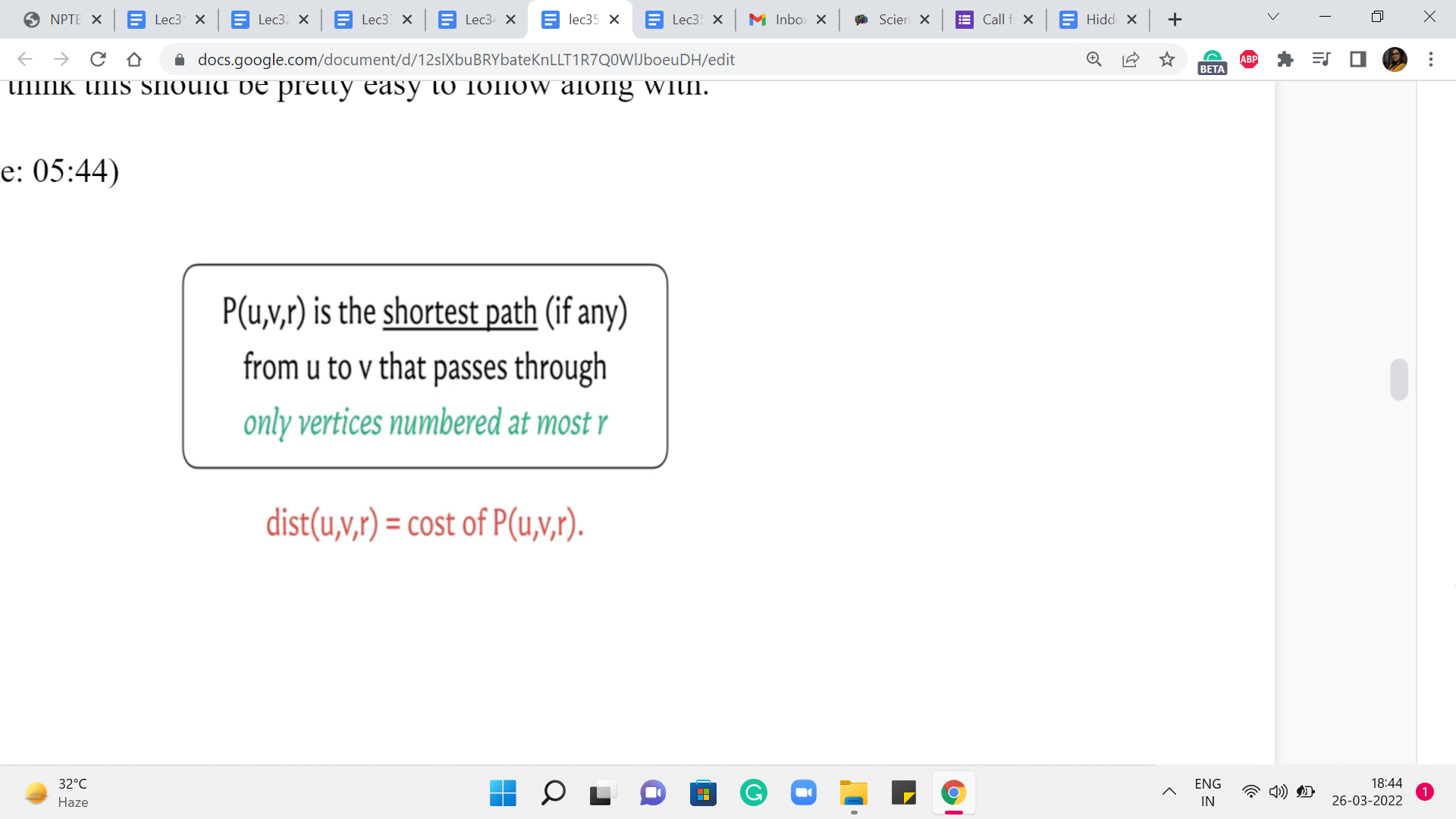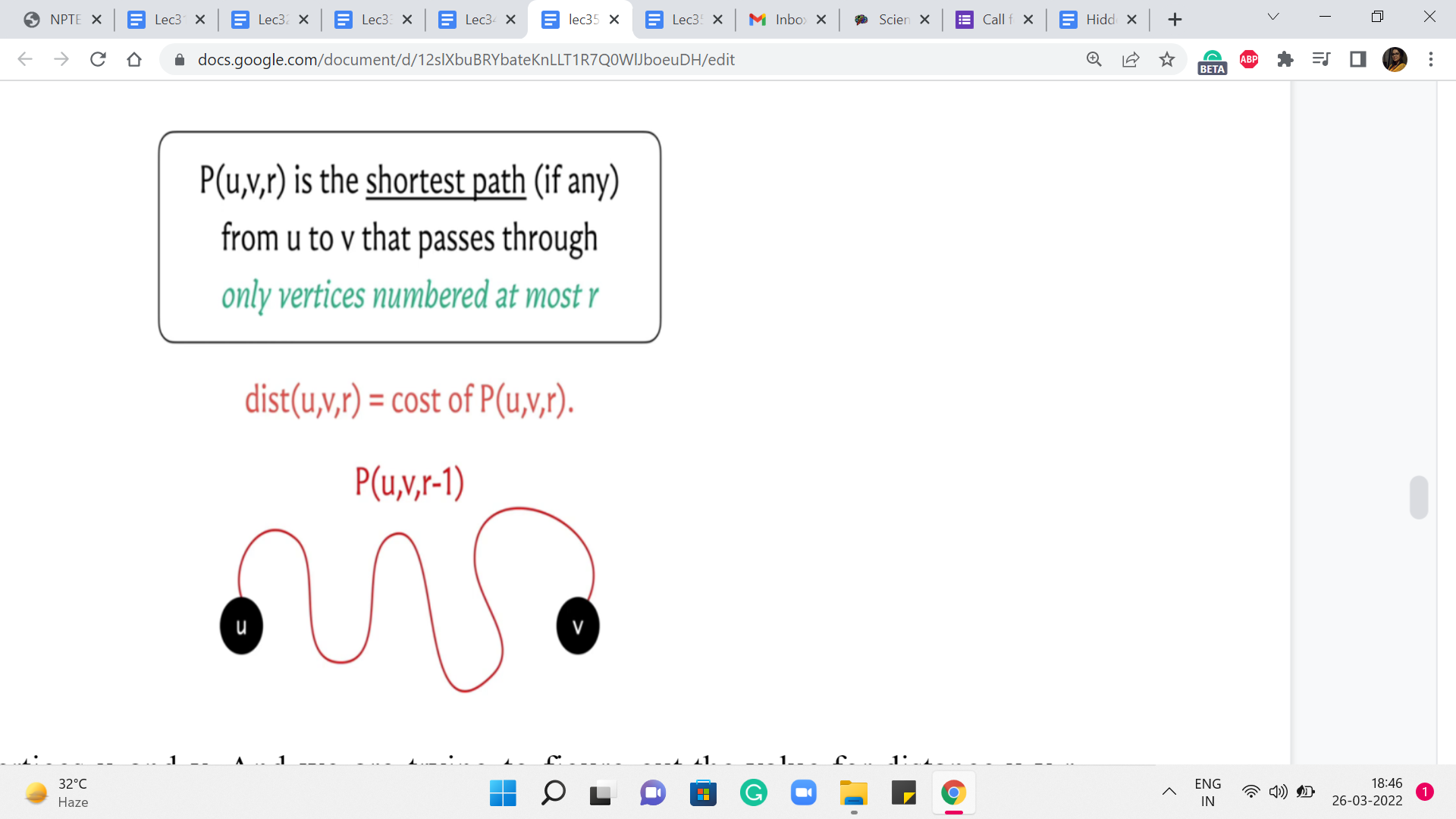 So, just like we do in a proof by induction, my focus here will be on trying to explain how we compute distance u v r under the assumption that you already know the correct values for distance u v r prime, for r prime < r. So, hopefully, that makes sense. And now let us come back to the question that we were posing earlier.
