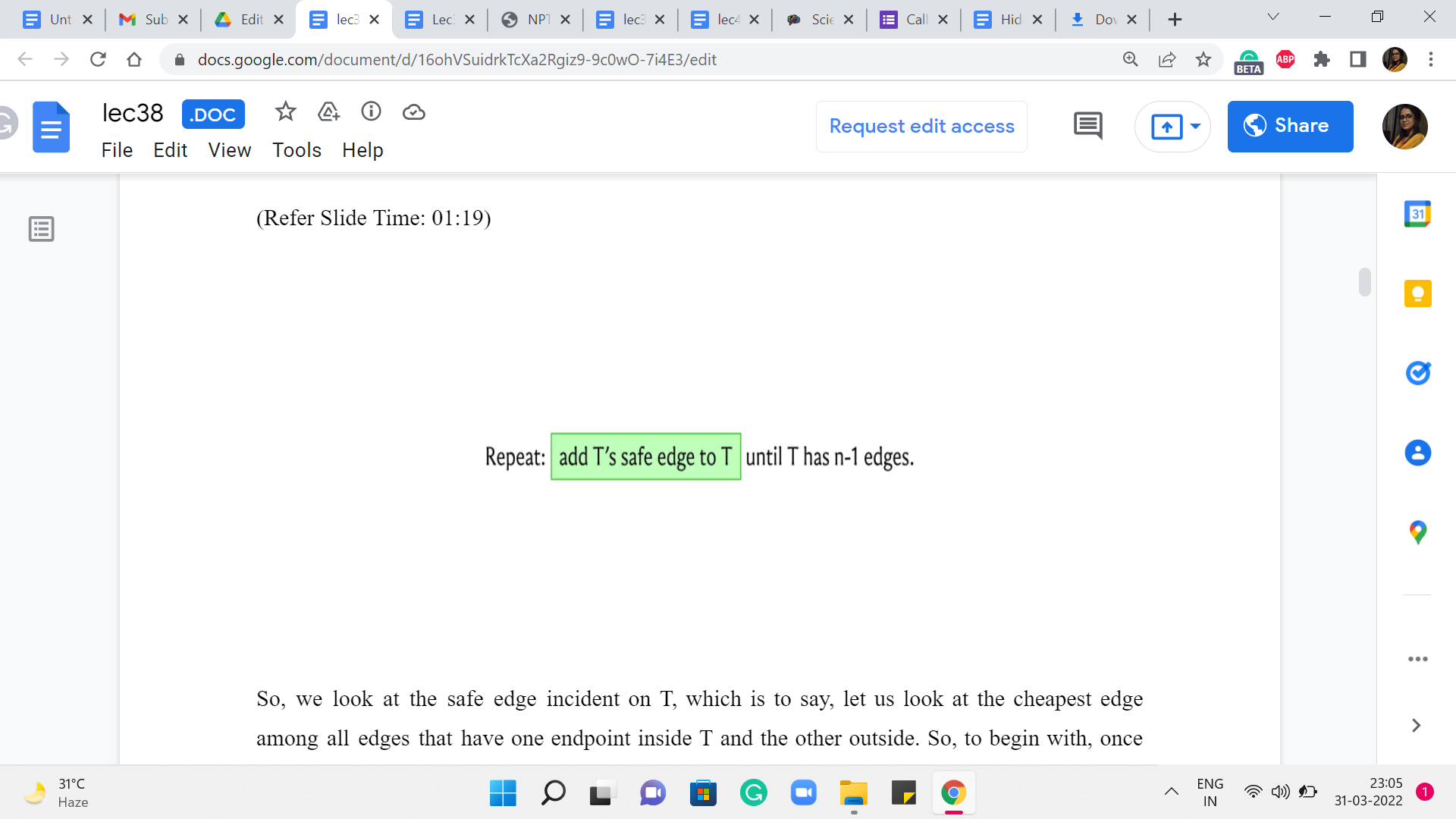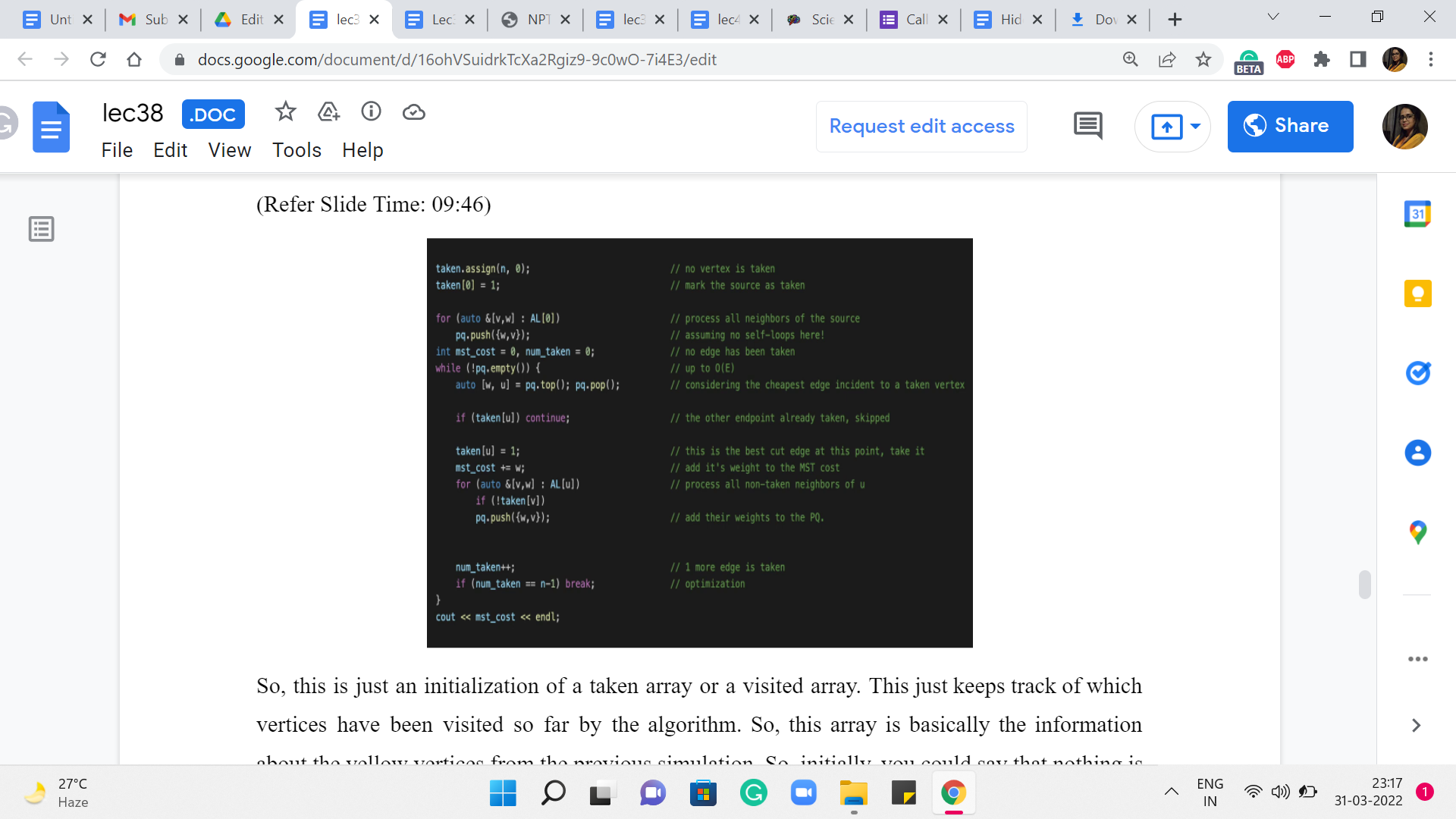 Now, once you are done with this, all you have to do is update the number of taken edges by 1 and implement the sanity check that we discussed. If at this point, you have taken ‘n-1’ edges already, then you can quit this loop, and you are done. And once you are out of the loop, of course, you can print the cost of the MST or, if required, you could write a loop to print all the edges that belong to the MST.