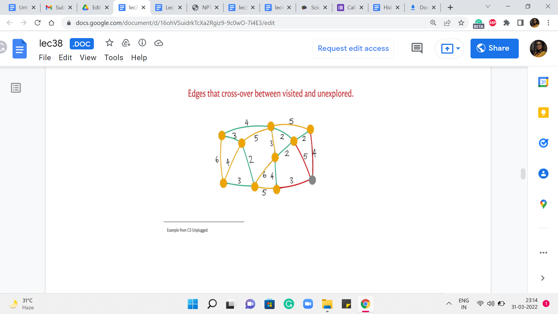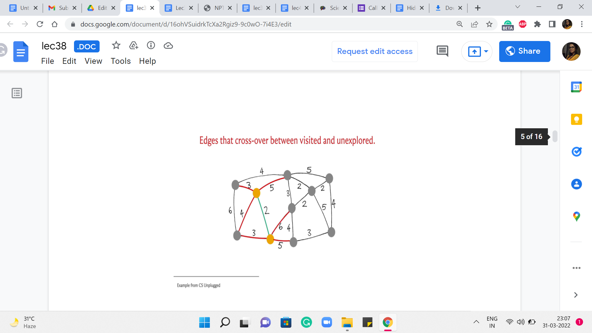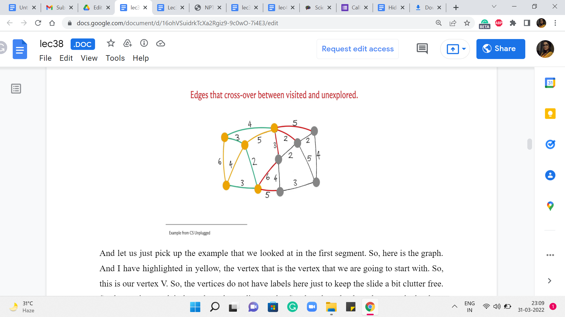 Typically, what we will do is we will then highlight in green, the cheapest edge among all of these edges that are under consideration. And then, once we have identified this edge, we are going to bring in the vertex, which is at the other endpoint into the fold of T. These are vertices that you can think of as the visited vertices, the seen vertices. So, such witnesses will also be marked yellow. So, as and when we see more and more vertices as the component T bells out, all the vertices that belong to T will be marked yellow.