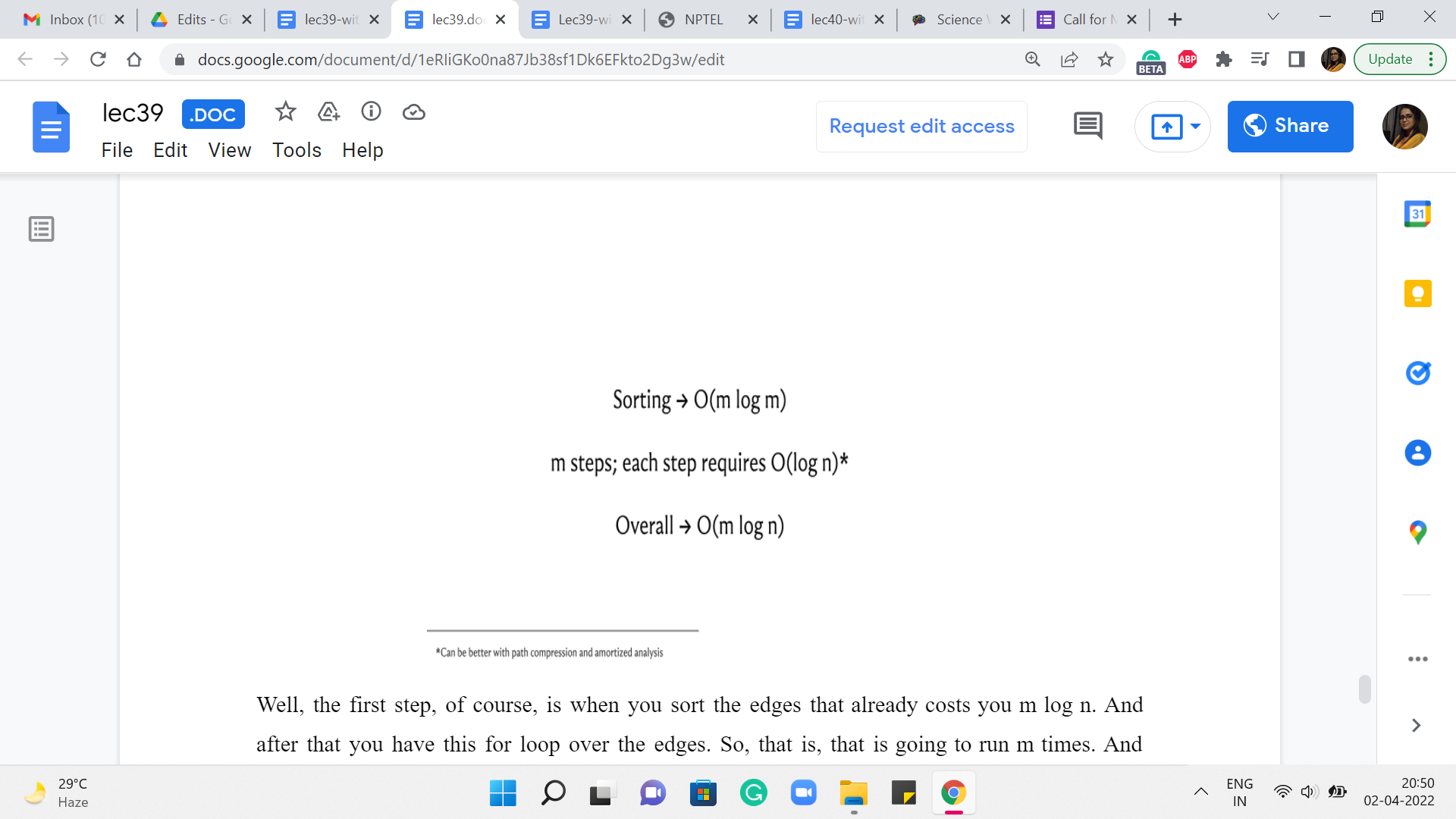 So, those are operations from the UnionFind data structure, and their expense will depend a little bit on the implementation. You know that if you do something like path-compression-based implementations with union-by-depth heuristics, then you could get as good as near-constant amortized complexity. But even if you do a fairly simple union by rank implementation, even the worst-case complexity of each of these steps can be bounded by log n.