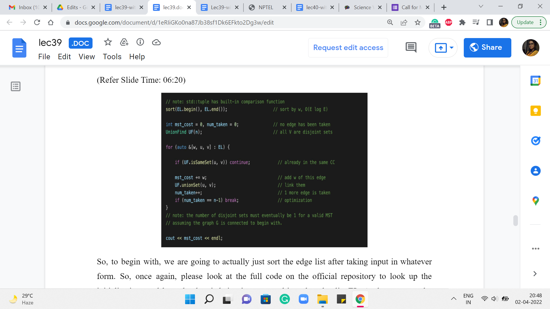 So, the way this works (because the weight is the first component of this triplet), when you do the sort of a sort, it is going to sort according to the first component. So, that is nice and convenient from our point of view. So, the next thing is again, the standard initializations. We have these even for Prim’s algorithm. So, mst_cost is initialized to 0. It is the variable that will help us track the cost of the MST that we are building, and num_taken again keeps track of how many edges we have included in our spanning forests so far.