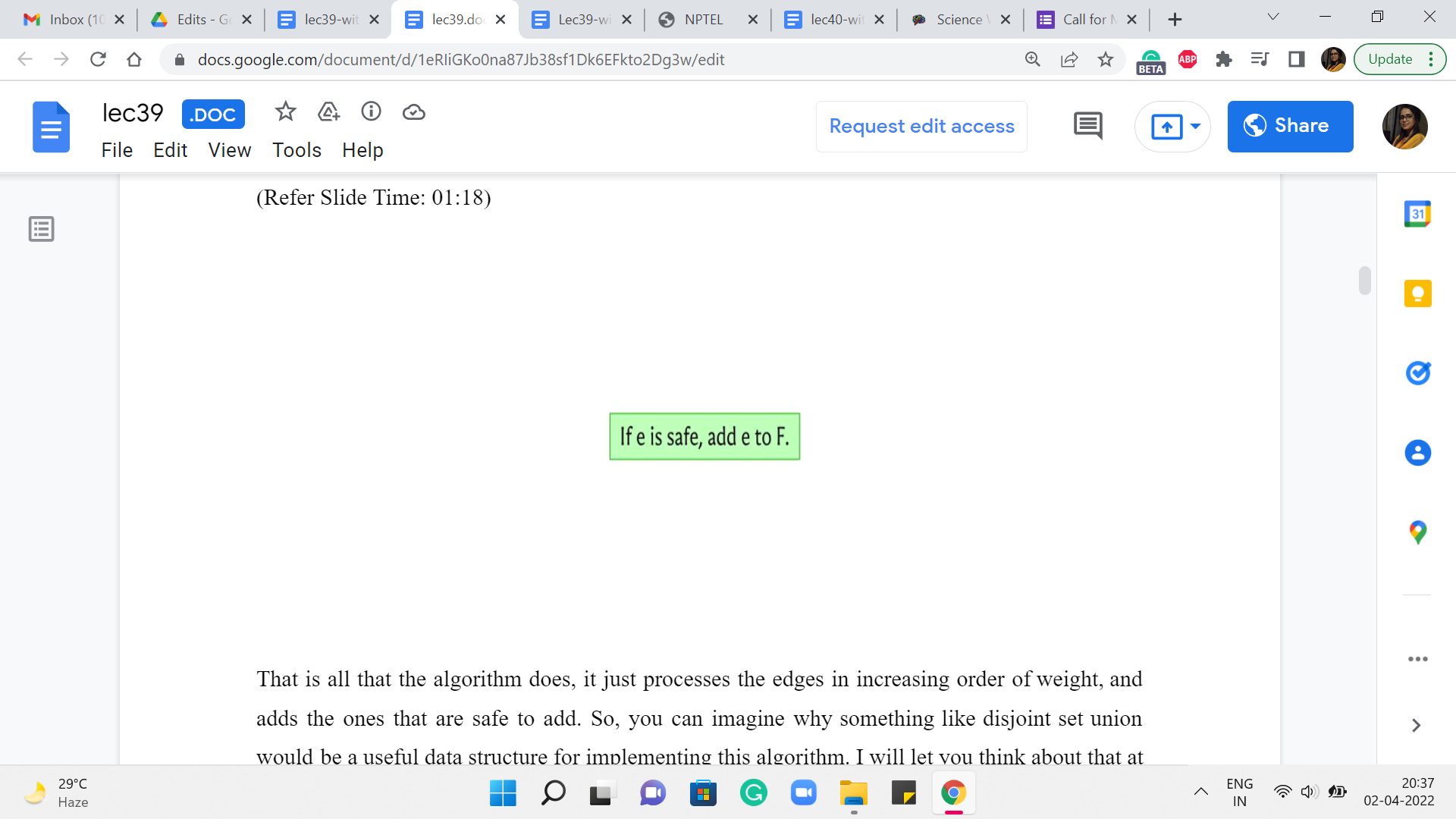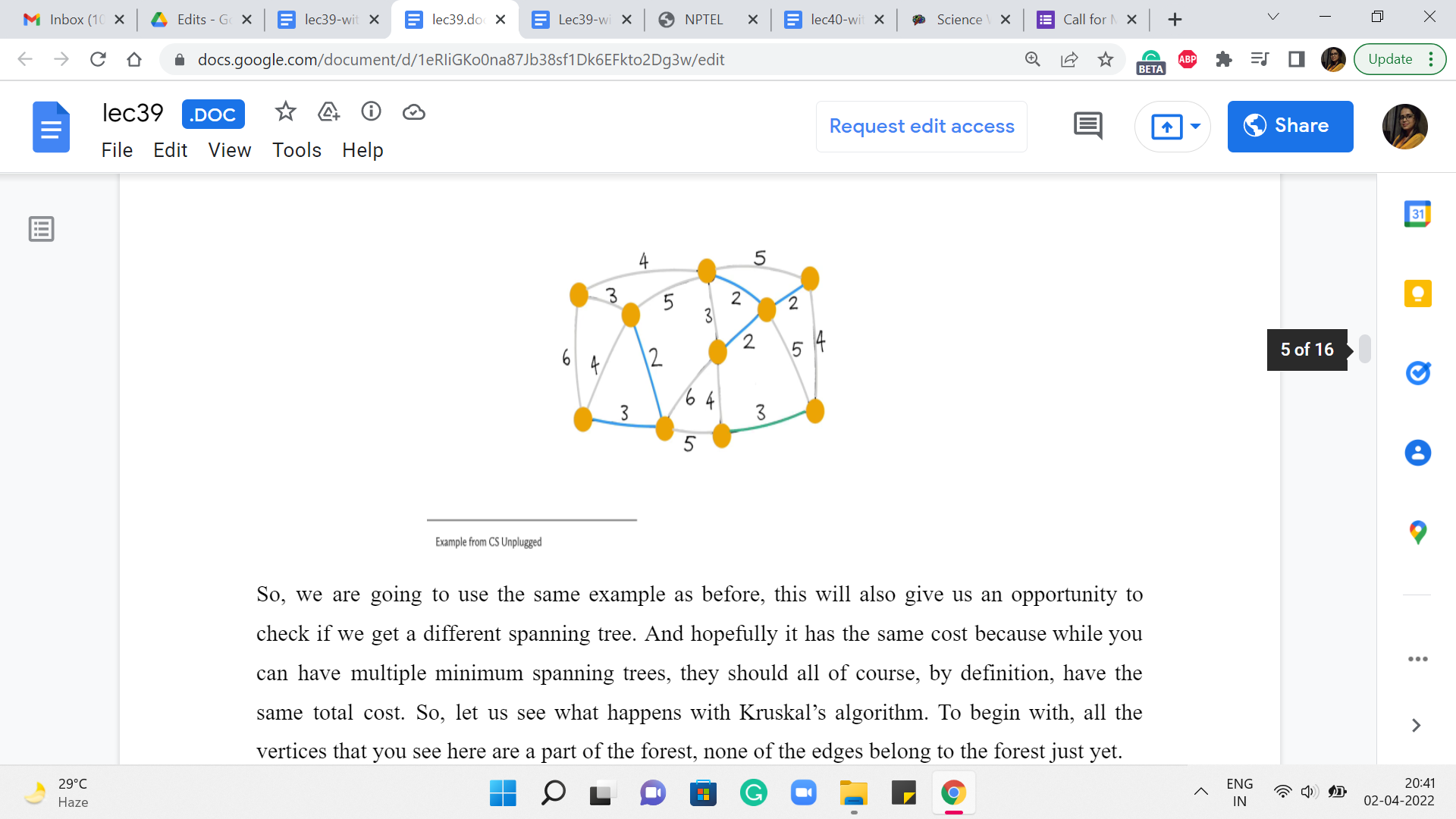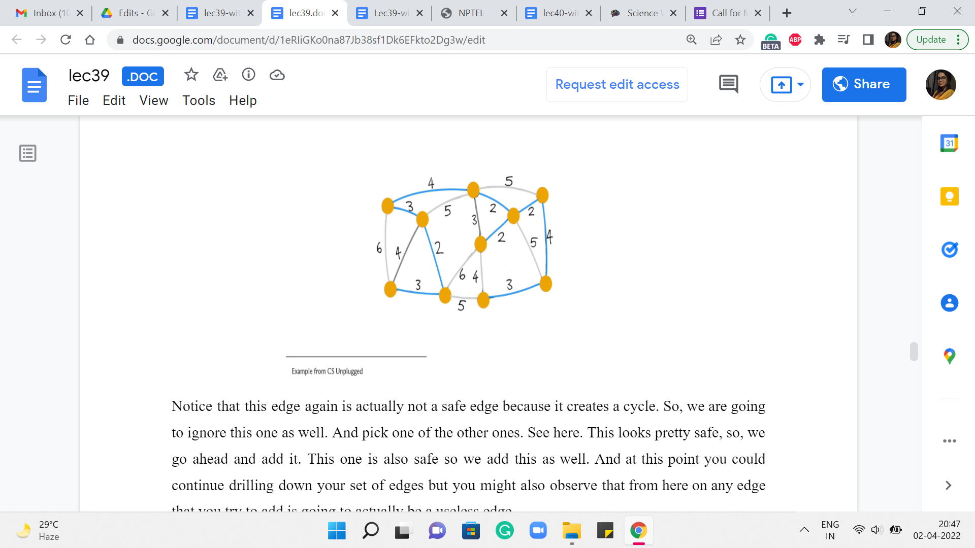 That is all that the algorithm does. It just processes the edges in increasing order of weight and adds the ones that are safe to add. So, you can imagine why something like a disjoint set union would be a useful data structure for implementing this algorithm. I will let you think about that in the back of your mind. While let us just go over a simulation, once again, just to be sure that we have a common understanding of the mechanics of the algorithm.