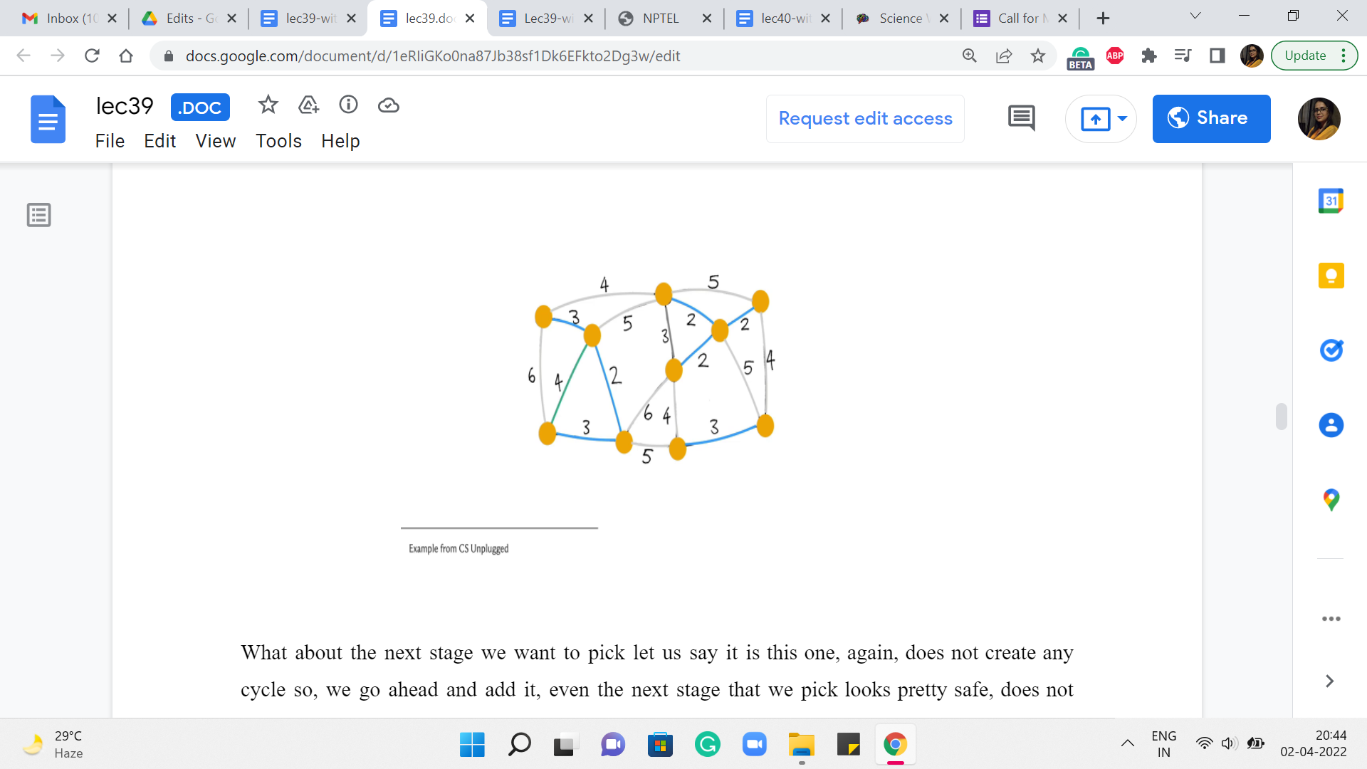 Let us say we look at this one, once again, looks safe. So, we add it. The next edge we pick is, say this one, again, a safe edge. So, it gets added. The next edge is also safe and also gets added to the structure that we are building up. Now the next edge that has minimum weight again, you have a few choices here. Let us say we pick this one. This again, looks safe – does not really create any cycles – so, we go ahead and add it.
