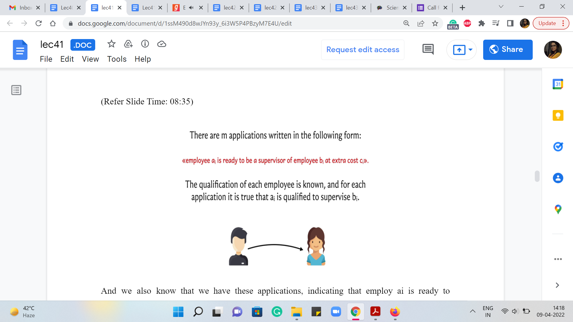 So, there are m applications in the following format. Employee ai is ready to be a supervisor of employee bi at an extra cost of ci. The qualification of each employee is known and for each application, it is true that ai is qualified to supervise bi. Now in this part of the problem statement you are not told anything more about what it means for ai to be qualified to supervise bi.