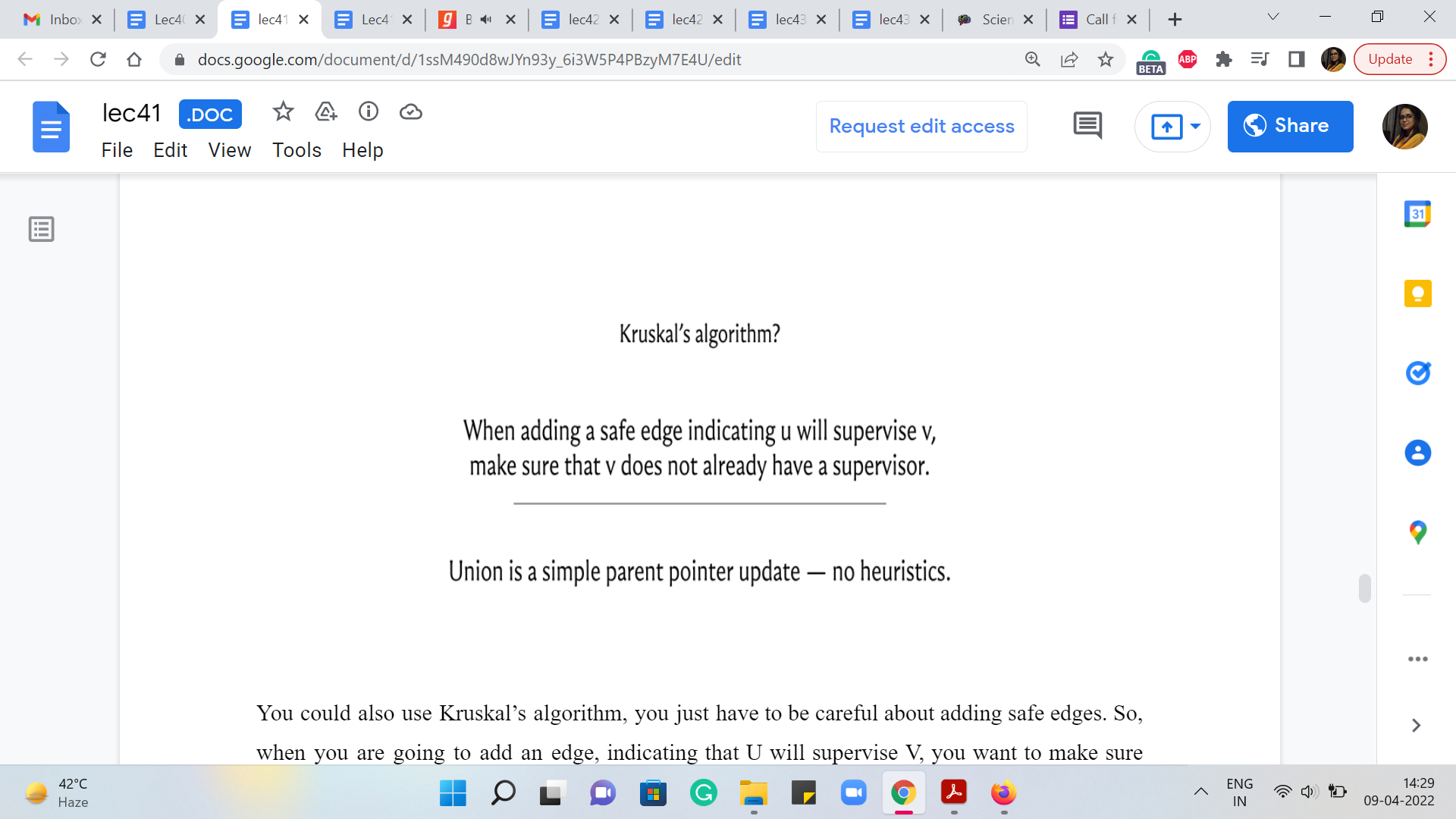 Now, we run Kruskal’s algorithm as usual. If we actually have collected ‘n - 1’ edges, then we make an early exit from this loop. And otherwise, we are basically looking at the current edge, which indicates that U is willing to supervise V. That is how we added the edges in the first place. And the first part of the ‘if’ condition that you see here is the standard Kruskal’s algorithm condition, which determines if the edge is safe or not.