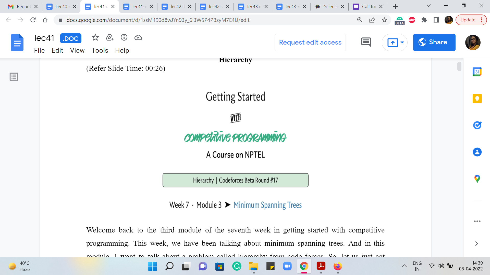 Welcome back to the third module of the seventh week in Getting Started with Competitive Programming. This week, we have been talking about minimum spanning trees. And in this module, I want to talk about a problem called ‘hierarchy’ from Codeforces. So, let us just get started with the problem statement here.