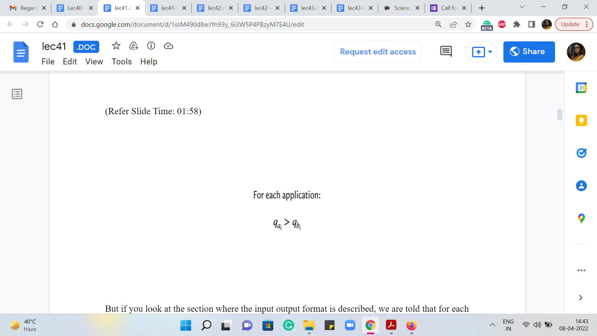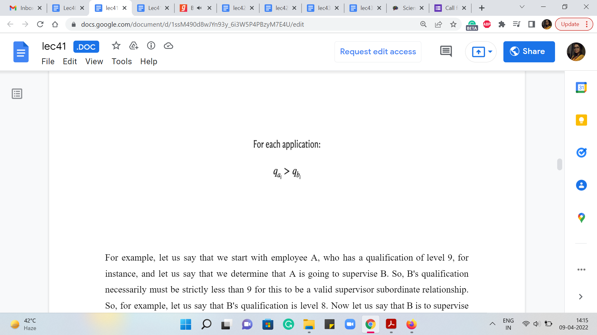 But if you look at the section where the input-output format is described, we are told that for each application, it is promised that qai is greater than qbi, where qx denotes the qualification of employee x. So, it is good to know that that is what it means for one employee to be qualified to supervise another, that their qualifications are strictly greater than the person that they are expressing willingness to supervise.