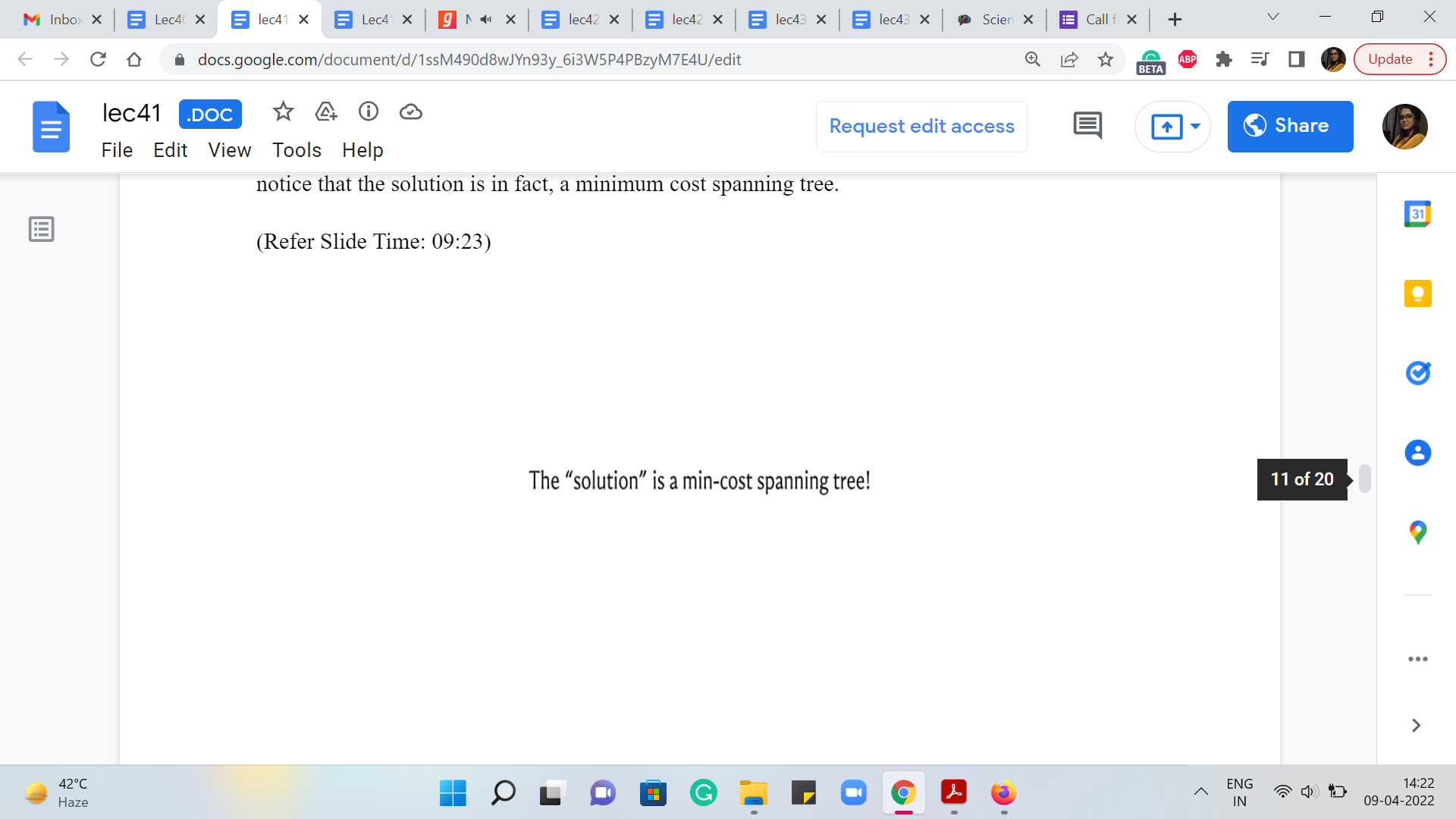 So, this means that there must be exactly ‘n-1’ edges in our subgraph. And also, we said that we are looking for a tree hierarchy. So, we said that there are going to be no cycles. So, notice that the solution is, in fact, a minimum cost spanning tree.