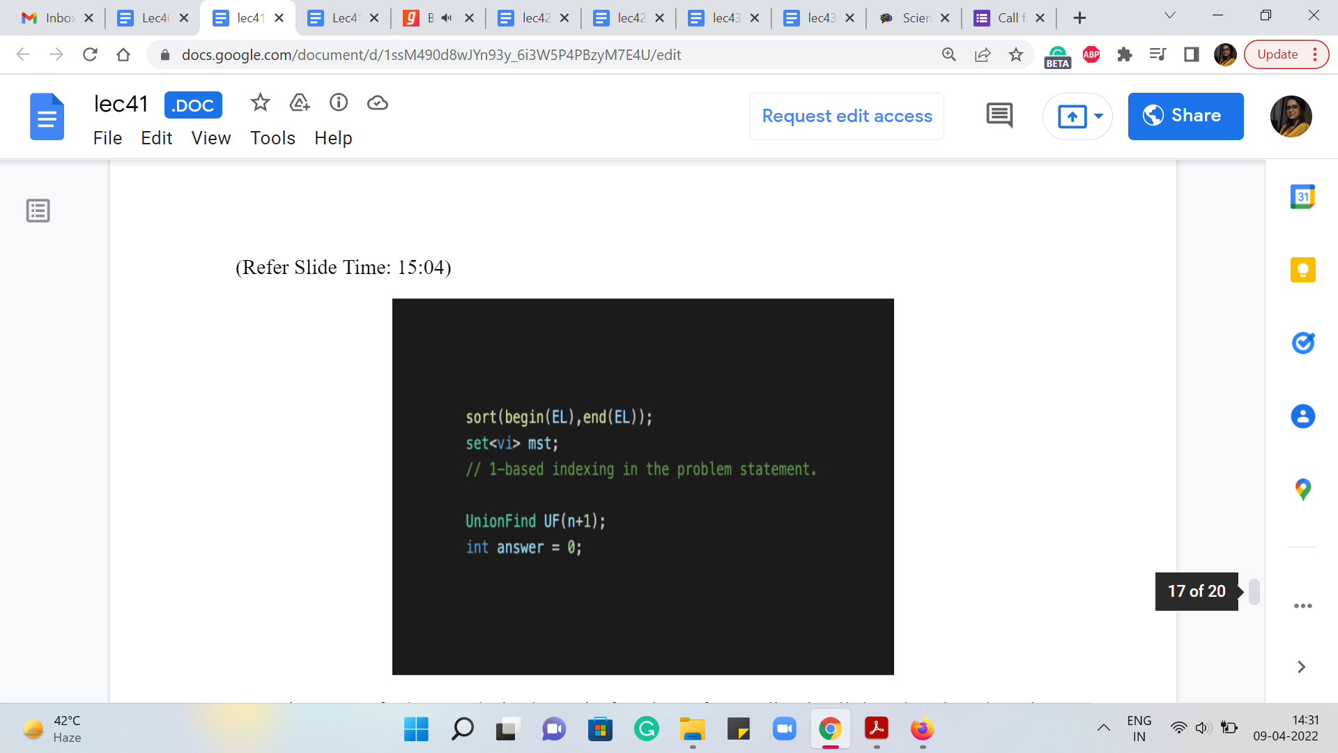 Now, in terms of what we do in the main function, after reading all the edges based on the applications and making sure that, you know, we use the standard format of the edge list: the first coordinate in the tuple being the cost and then the second and the third coordinates, corresponding to the directed edge from U to V. After having done that, as usual, we will sort the edges by weights as Kruskal’s algorithm would do. And now you will see that I also have an MST variable, which is a vector that will collect all the edges that we actually add to our spanning tree.