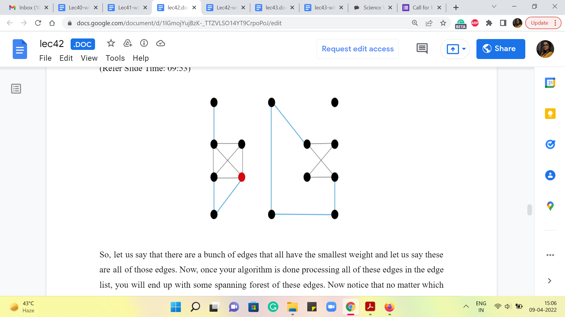 So, let us say that there are a bunch of edges that all have the smallest weight, and let us say these are all of those edges. Now, once your algorithm is done processing all of these edges in the edge list, you will end up with some spanning forest of these edges. Right. Now notice that no matter which spanning forest you end up with, the set of vertices, which is connected to the main island remains the same, and all of them will actually have the same ‘ti’ value. I hope that makes sense.