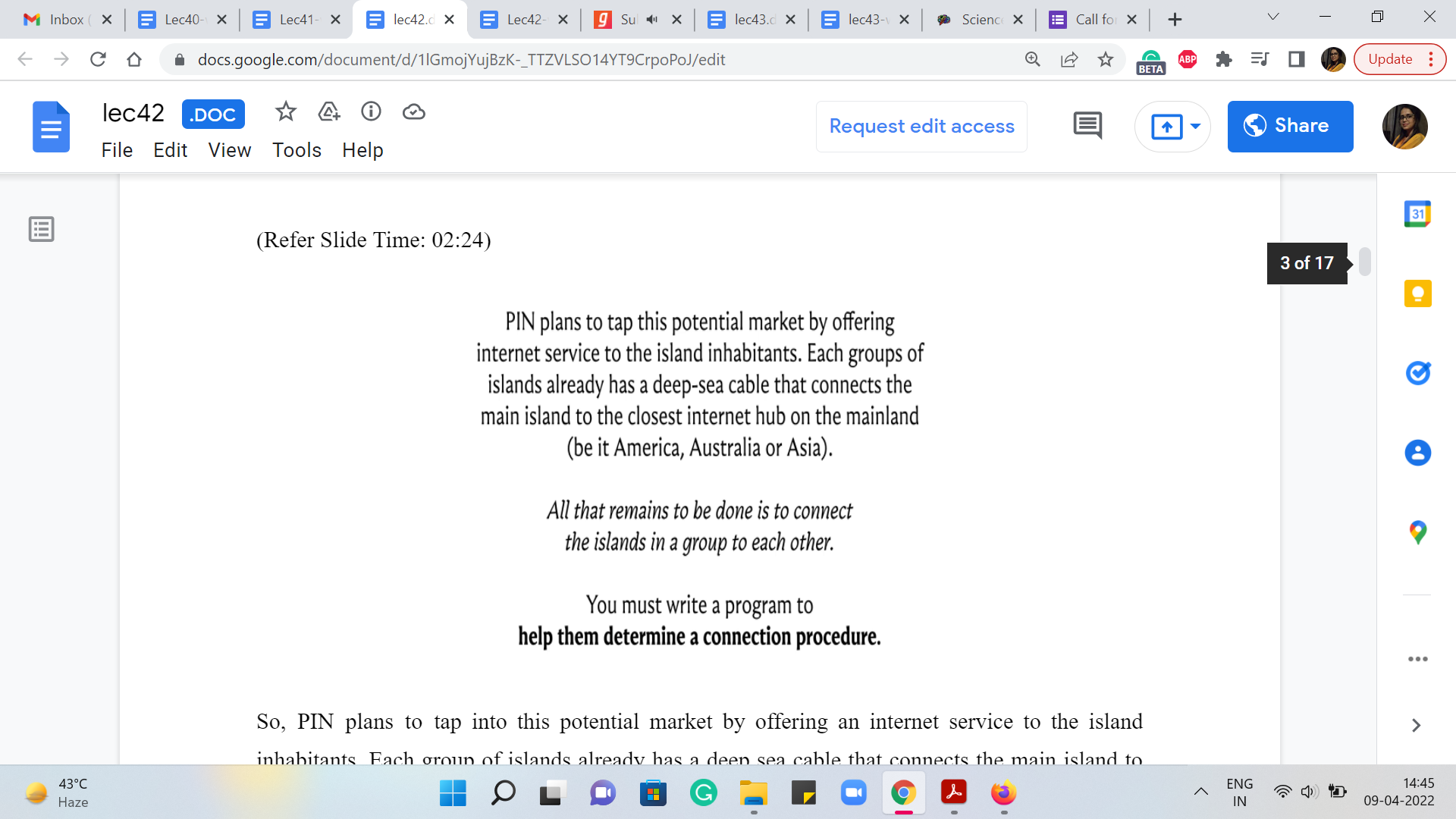 And you must write a program to help them determine a connection procedure. So, it already feels like we need to connect a bunch of islands within each other. And it seems like this is already feeling like some sort of a spanning tree problem. Let us move on.