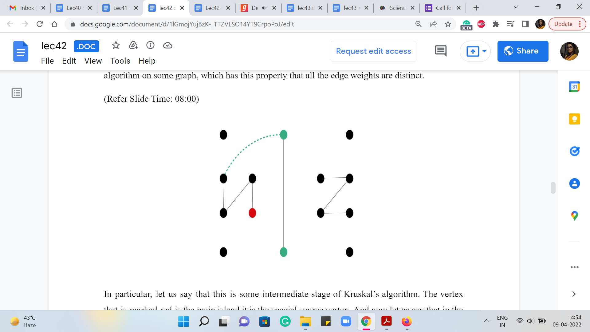 So, this is the time when these islands, if you like, are getting connected to the internet. And this is the time to make a record of ‘ti.’ Now what is ‘ti?’ It is the most expensive edge on the path to the red vertex. But this expensive edge must be the dotted green edge because we know that all the edges that were added before this, were actually cheaper edges. Because that is just the sequence in which Kruskal’s algorithm is going to be adding edges to the spanning forest.