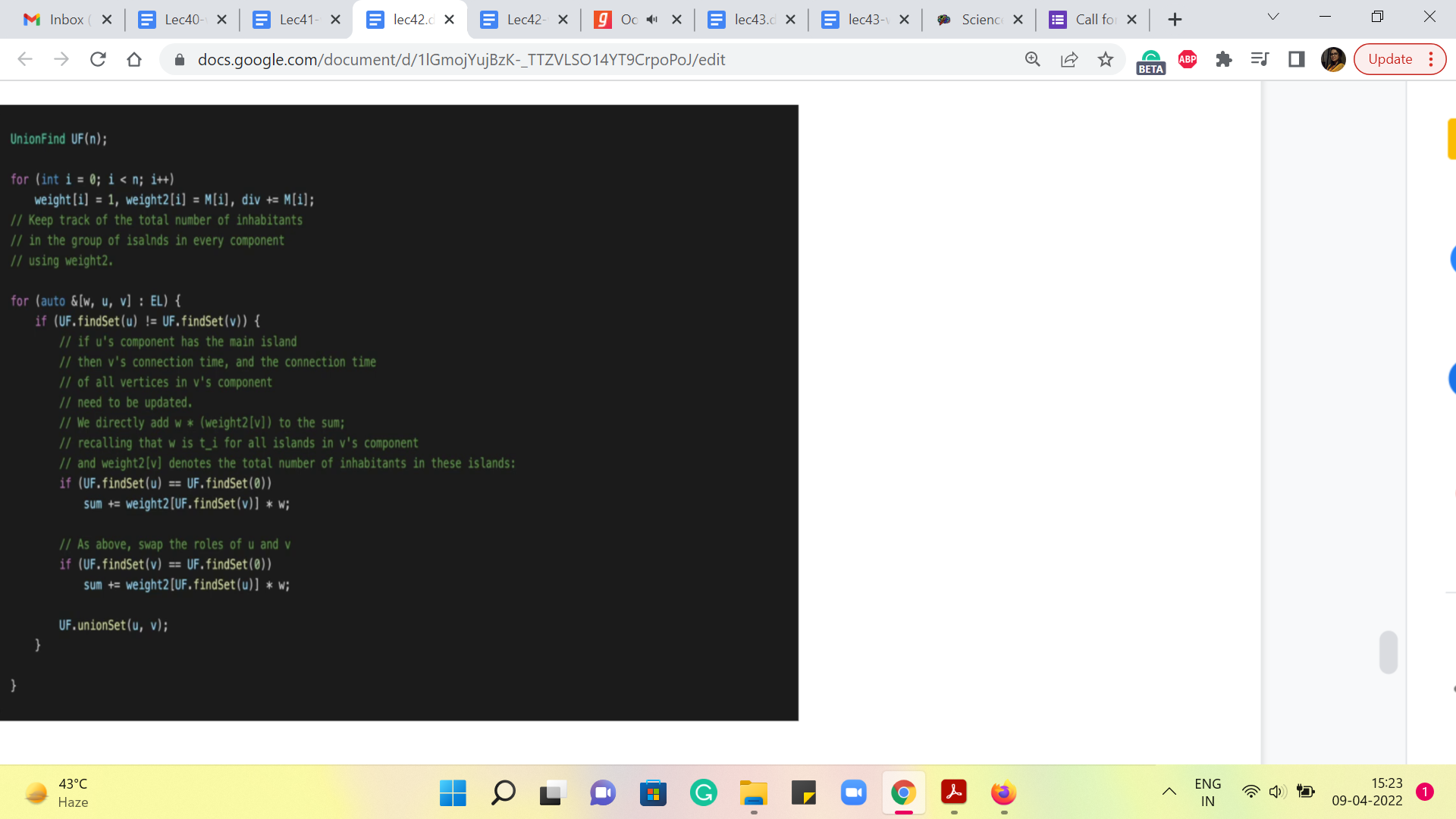 No matter what the scenario, you do want to physically merge these components, and that is what the union operation in the last line of this block will do for you. So, that is pretty much the whole algorithm. What you want to do at the very end is make sure that you print the value of the sum divided by ‘div,’ which is declared on the third line that you see on your screen right now; ‘div’ essentially is the total number of inhabitants across all the islands.