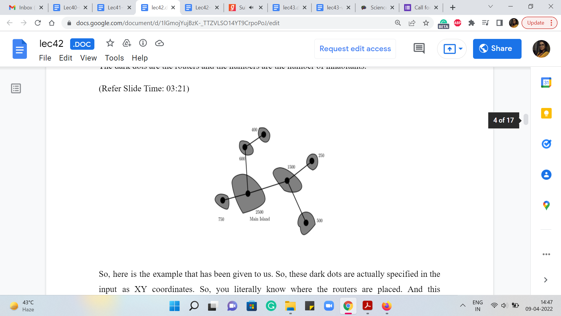 So, this is in fact the quantity that you have to output. So, for each island, you want to somehow keep track of what is its connection time. So, if you can figure it out ti for every Island corresponding to your spanning tree, then it is just a matter of computing this expression, which is straightforward to do. Now, one question that might occur to you is well, should the spanning-tree be optimized to optimize the average time?