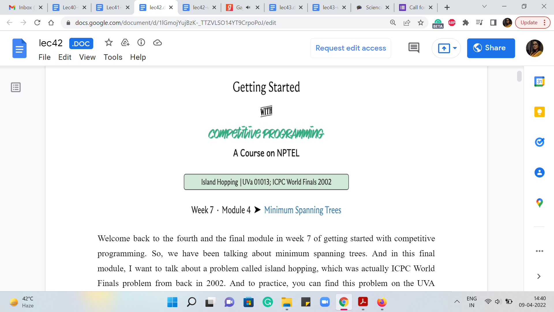 Welcome back to the fourth and the final module in week 7 of Getting Started with Competitive Programming. So, we have been talking about minimum spanning trees. And in this final module, I want to talk about a problem called ‘island hopping,’ which was actually the ICPC World Finals problem from back in 2002. And to practice, you can find this problem on the UVA platform, the problem ID is 1013.