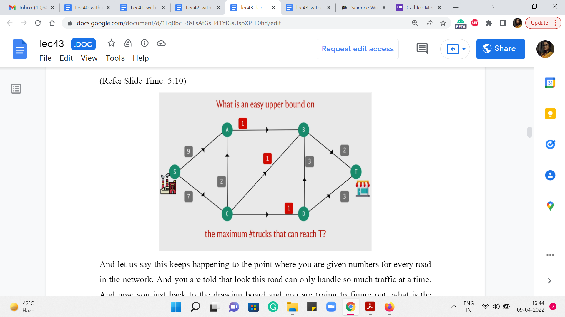 So, here of course we have assumed also that there is no pre-existing flow and these are the original capacities. In general you might be in a situation, where you have already designated a plan where some trucks may already be using certain edges, in which case you will have to work with the remaining capacity as opposed to the original capacity. But let us not worry about that for now.