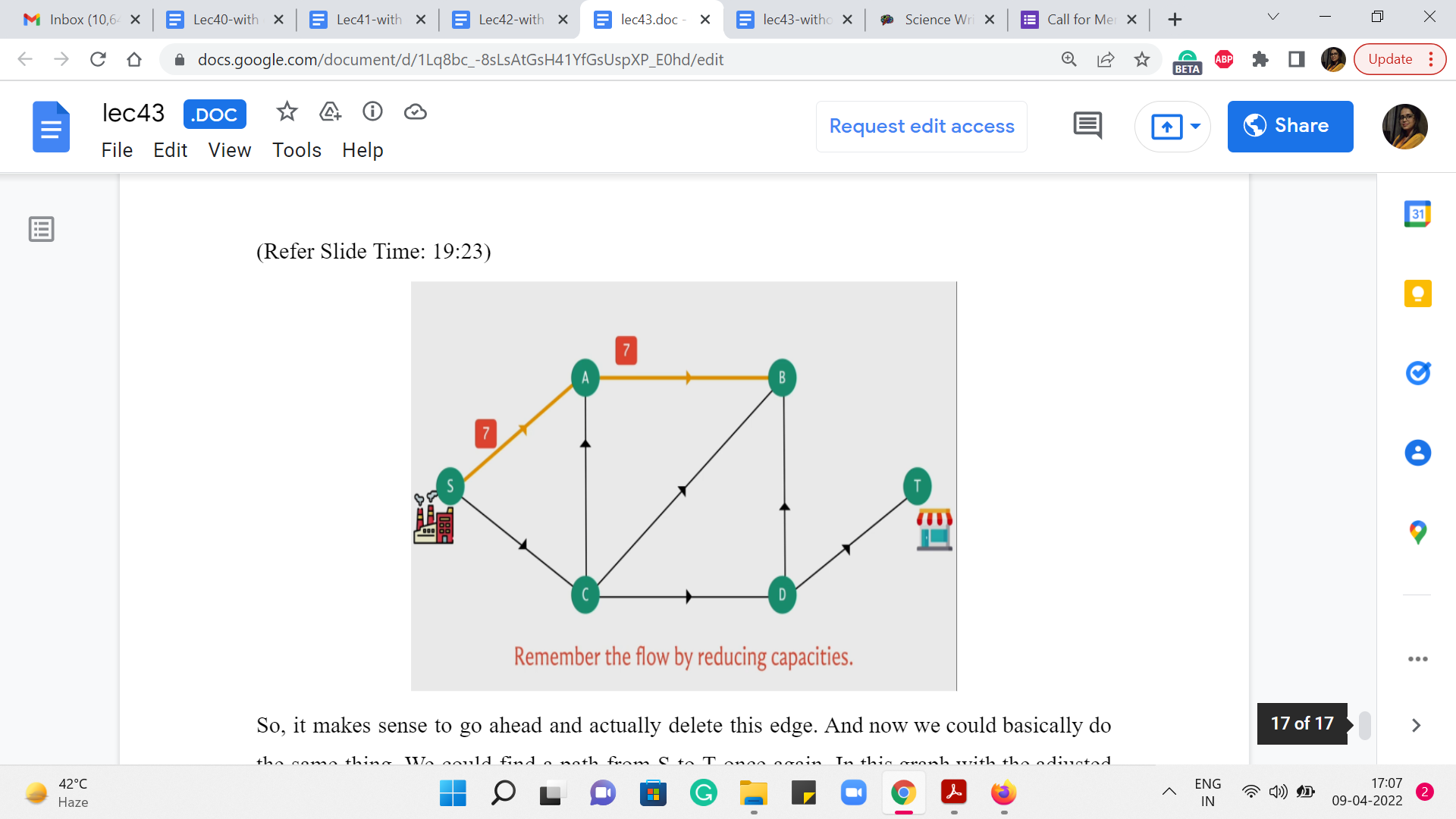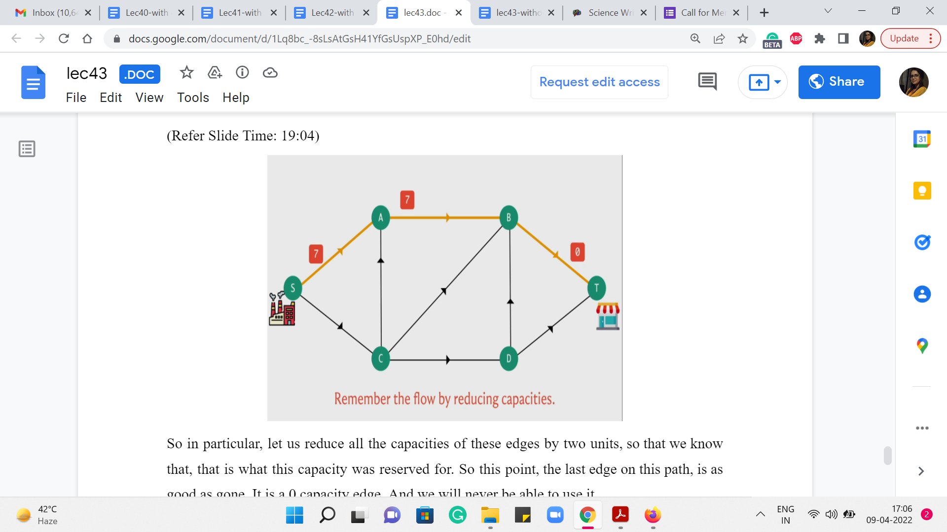 We could again adjust the capacities and we could keep doing this. At some point we are going to get stuck. And that is going to happen when you can no longer reach D from S. So, when S and T are disconnected from each other. That is when we can no longer continue to increment our flow, as I was just describing.