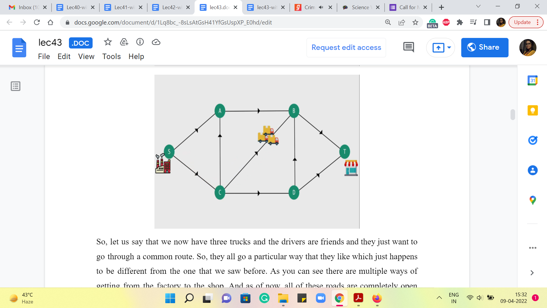 Let us say that at some point we have some construction work going on, on this road from C to B, because of which we are told that you cannot have more than one truck passing through this road at a time. Okay. So, this means that what we just did – have all the ‘three trucks’ that we have, use this road simultaneously – is no longer possible.