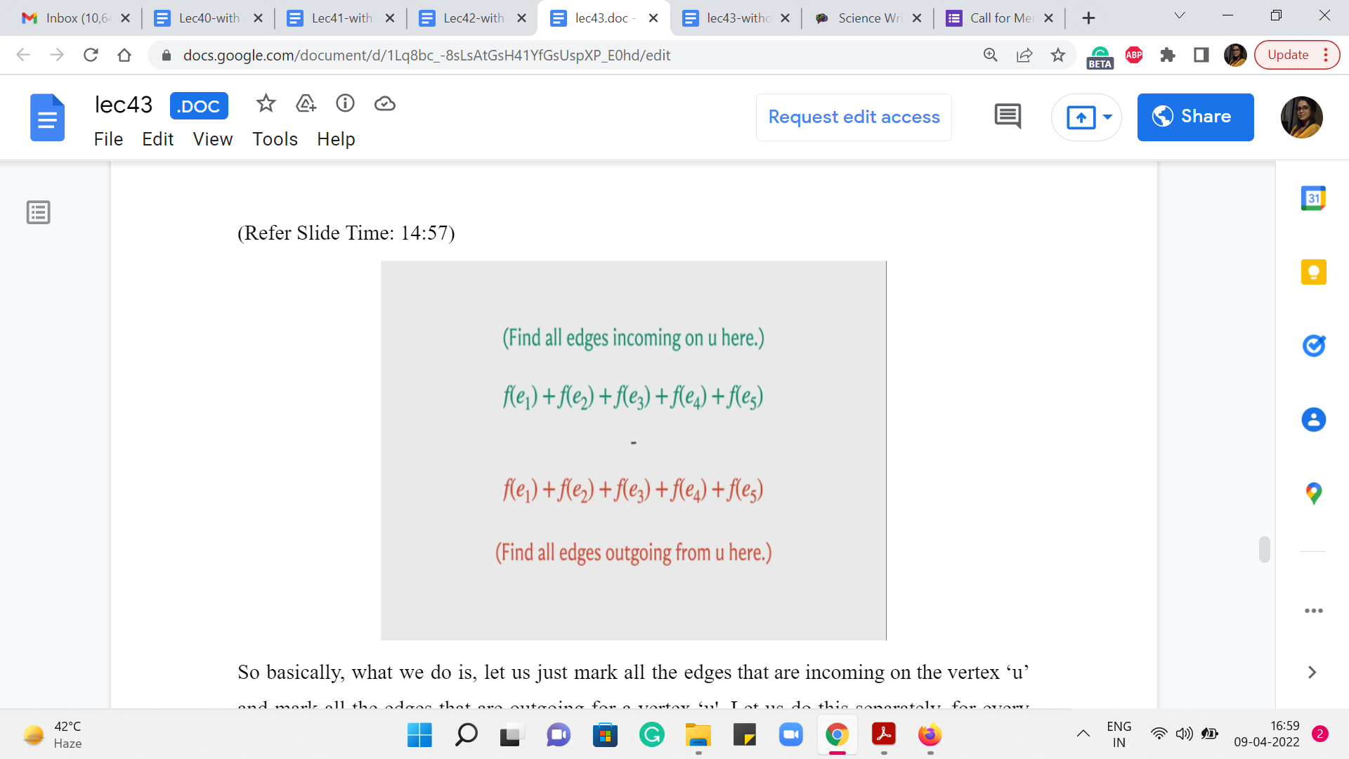 So basically, what we do is, let us just mark all the edges that are incoming on the vertex ‘u’ and mark all the edges that are outgoing for a vertex ‘u.’ Let us do this separately, for every vertex ‘u’ other than the source and the target. So, when you do this for a specific vertex, when you identify all the numbers corresponding to the flows on the edges incoming to that vertex, and all the edges that are outgoing, well, you will zone in on a subset of numbers which will essentially cancel out because of the fact that this is a flow and it respects the conservation law.