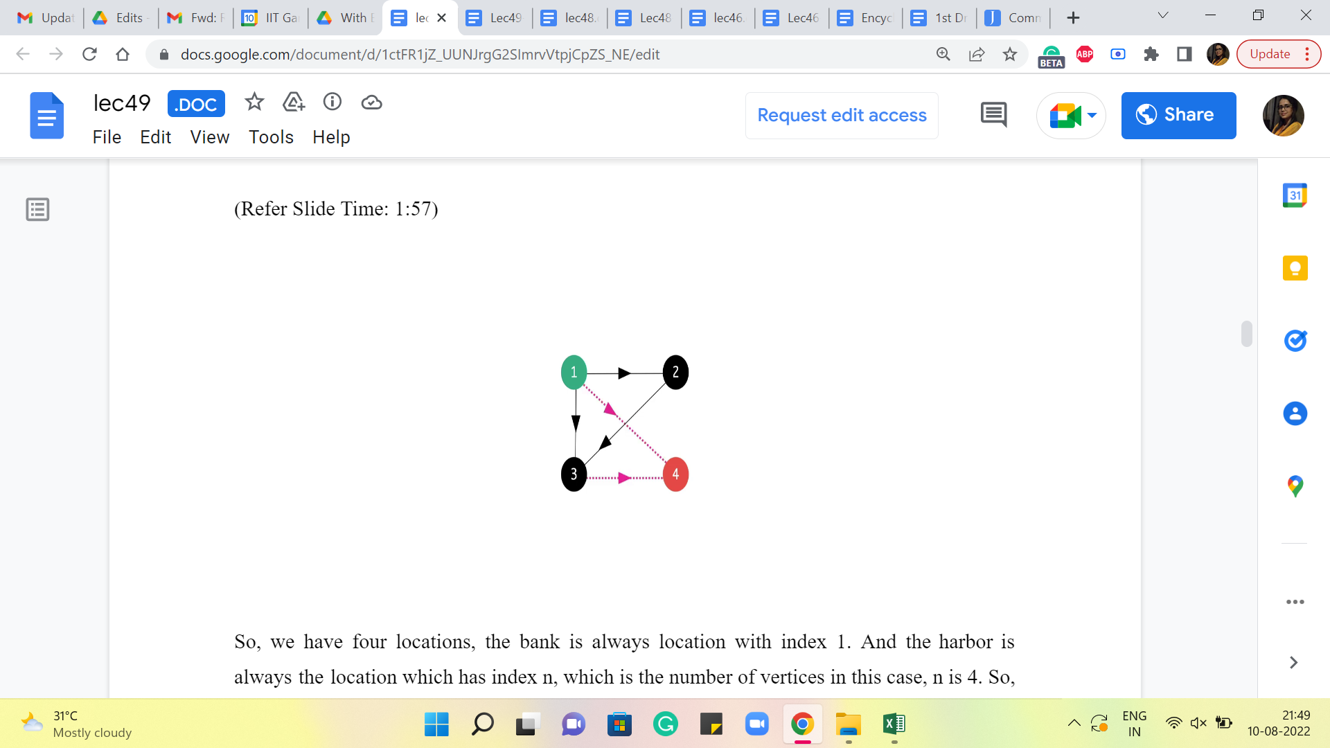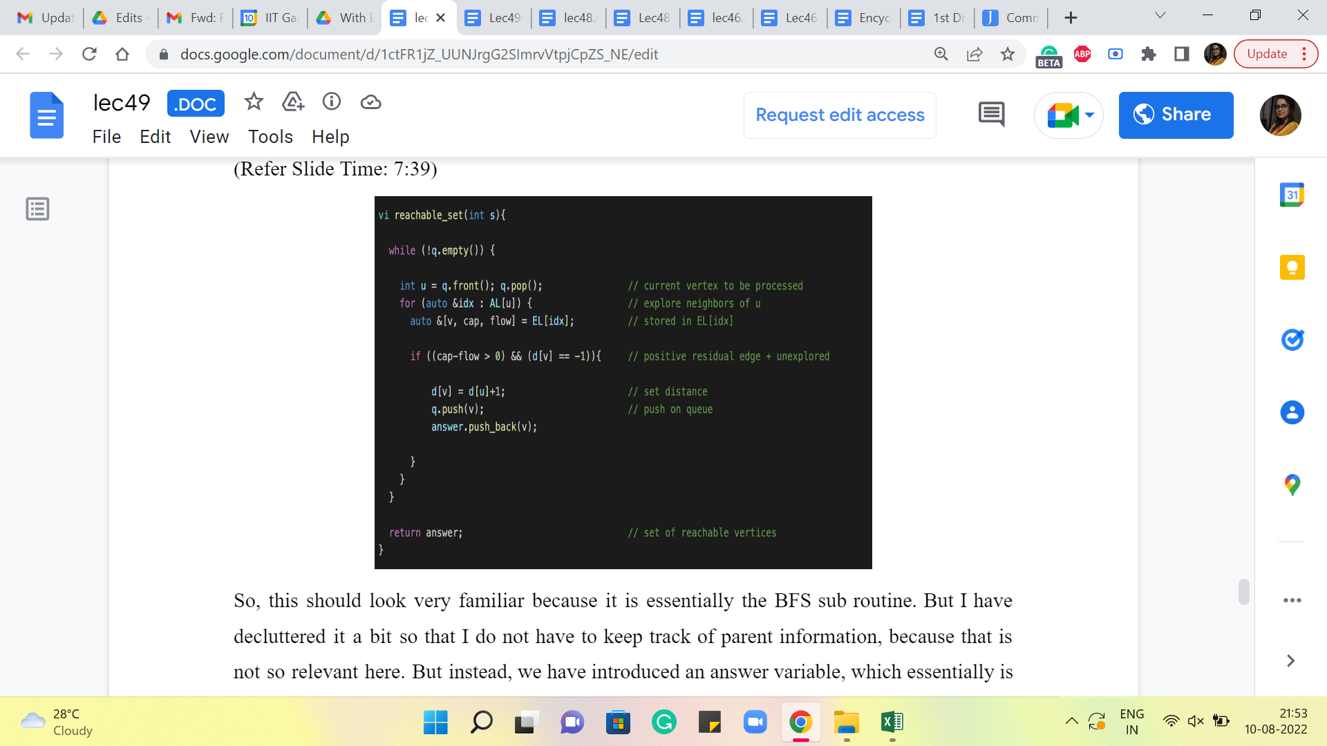 And you will need to declare the variables. Make sure that the queue has the word access, to begin with and that the distance vector has been initialized appropriately. And that the distance of the source vertex is set to 0. So, these are a few things that you do not see on the slide. But you can once again find the complete code in a link that is there in the description. So, you can refer to that instead if you are looking for a fully workable code, but ideally, you are just trying to write this out yourself as well. Just for good practice.