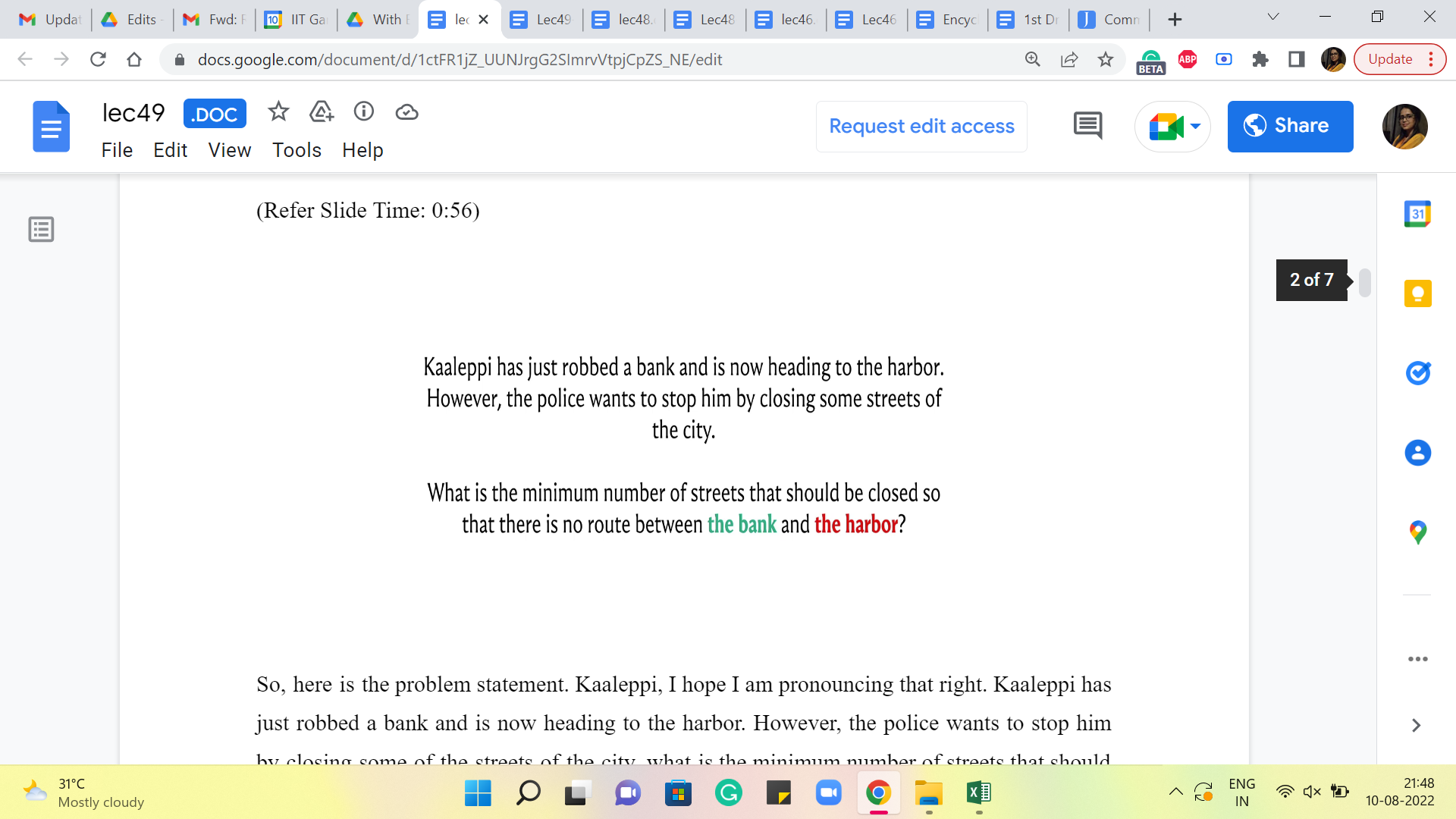 So, here is the problem statement. Kaaleppi, I hope I am pronouncing that right. Kaaleppi has just robbed a bank and is now heading to the harbor. However, the police want to stop him by closing some of the streets of the city. What is the minimum number of streets that should be closed so that there is no route between the bank and the harbor? So, I am going to assume that our friend is just finished robbing the bank and is at the source vertex, which corresponds to the bank here, and the police want to shut off some of the roads so that no matter what our friend does, he is not going to be able to reach the harbor.
