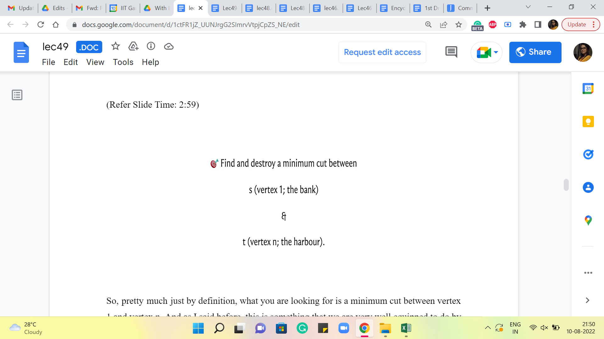 And fortunately, as we have discussed, the Ford–Fulkerson algorithm automatically gives us access to a minimum cut. And all that remains to be done is to identify all the edges that are crossing this cut. Now, of course, to do this, you do not have to explicitly identify the set ‘t’ like I am doing here. You could instead simply loop over all the vertices in s, look at the edges that are incident on these vertices, and identify all those edges that have their other endpoints, essentially not being in s.