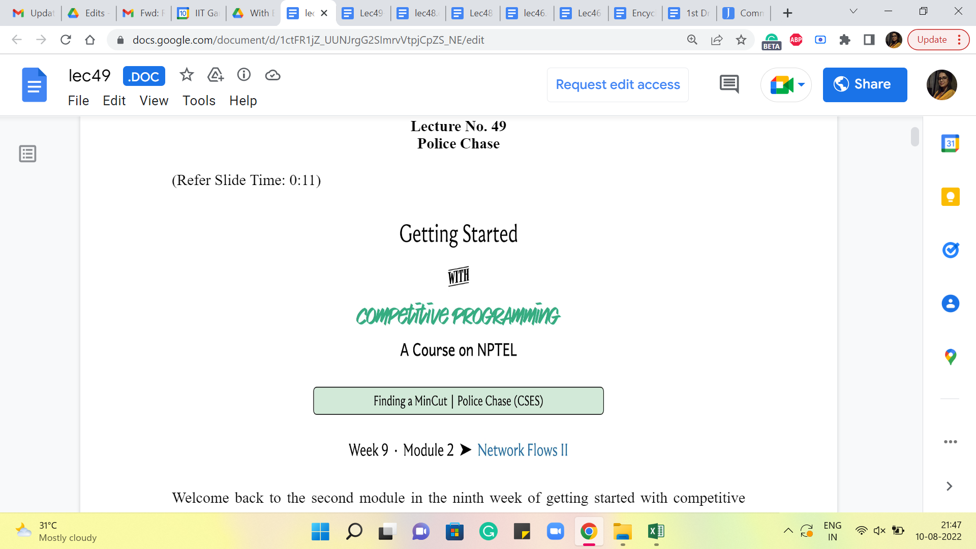 Welcome back to the second module in the ninth week of Getting Started with Competitive Programming. So, in the previous module, we just saw (about) the deep relationship between the value of a maximum flow in a flow network and the capacity of a minimum cut in the same network. In this short follow-up module, I want to talk about a problem that will give us an opportunity to implement the minimum cut algorithm that we hinted at last time.