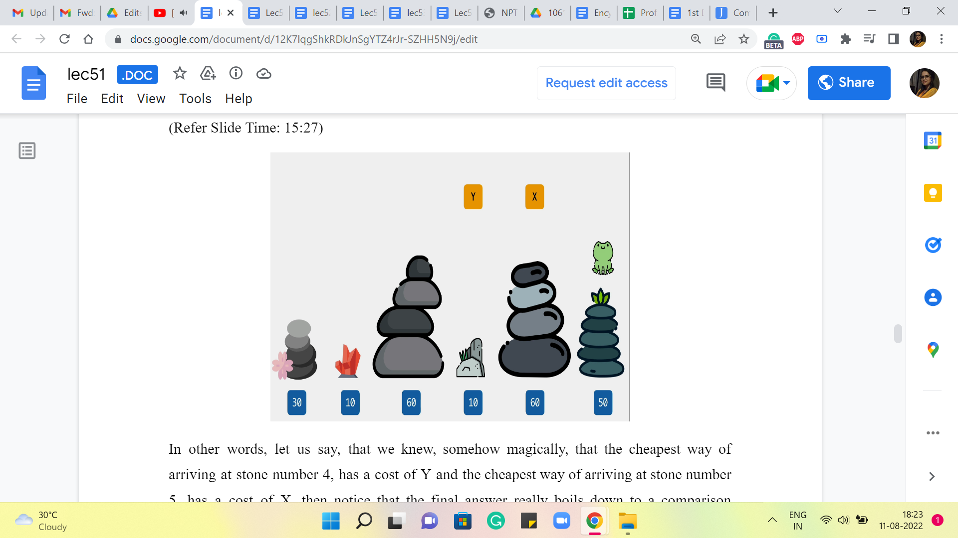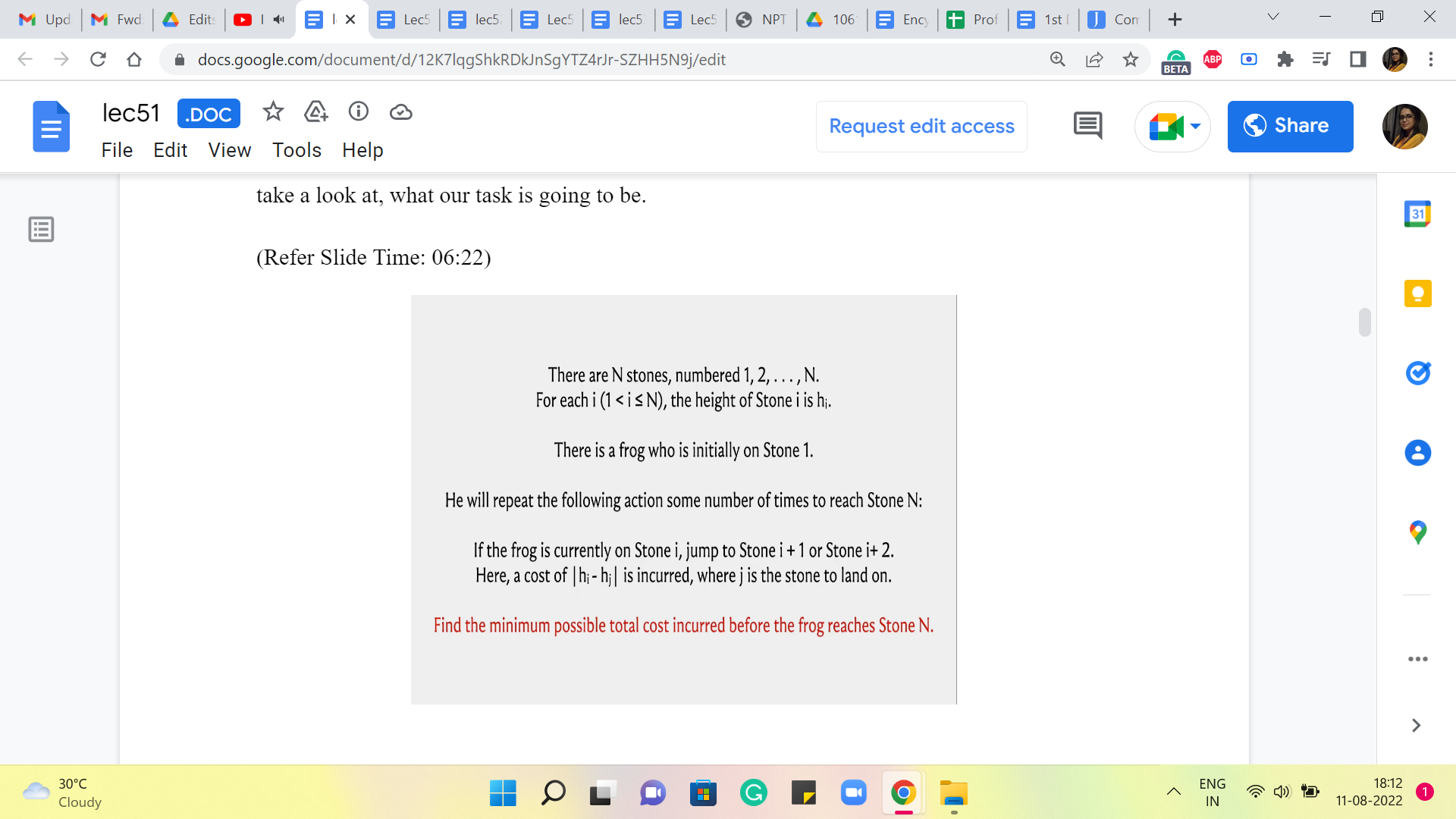 In that optimal sequence and if there are multiple optimal sequences, you could just fix any one of them, it can be arbitrary as long as it is fixed. And in that optimal sequence, you want to ask yourself, well, how did the frog get to the N’th stone in this particular sequence? What was the penultimate step? And then we will try to take it from there. That will help us come up with an appropriate recursive formulation.