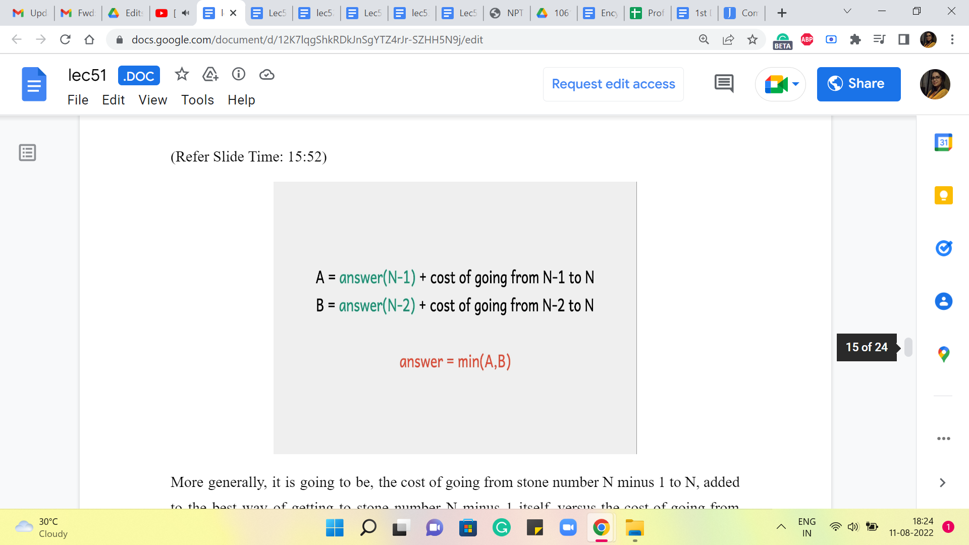 So, that is a fixed cost that the sequence has to pay, and beyond that, well, your optimal sequence has to get this turn number N-1 or N-2, as the case may be. And on that front, it cannot really hope to beat the answer of N-1 or the answer of N-2 because these quantities, by definition, are the optimal costs for reaching stones N-1 or N-2, as the case may be. So, hopefully, this sequence of arguments convinces you that this setup that we have here does lead you to the right answer. So, this equation is what we want to compute.