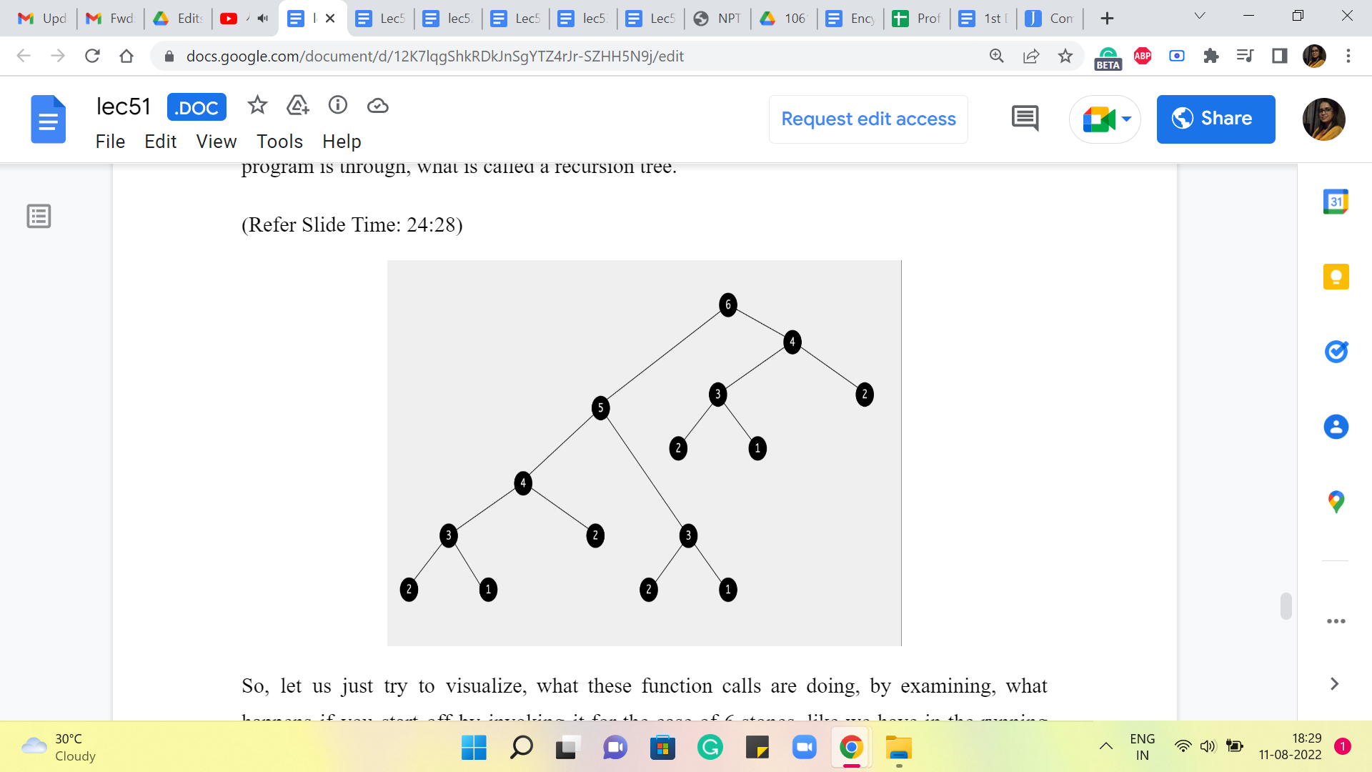 And so, I would like to take you back to the recursion tree here. And I am going to request you to spend some time staring at this and see what is really going on here. And is there something that we can do to fix the situation that we have landed ourselves in? Incidentally, notice that this recursive tree actually has a leaf corresponding to every possible sequence that the frog could take in going from 1 to n. In that sense, we have really here a visual representation of the entire search space.