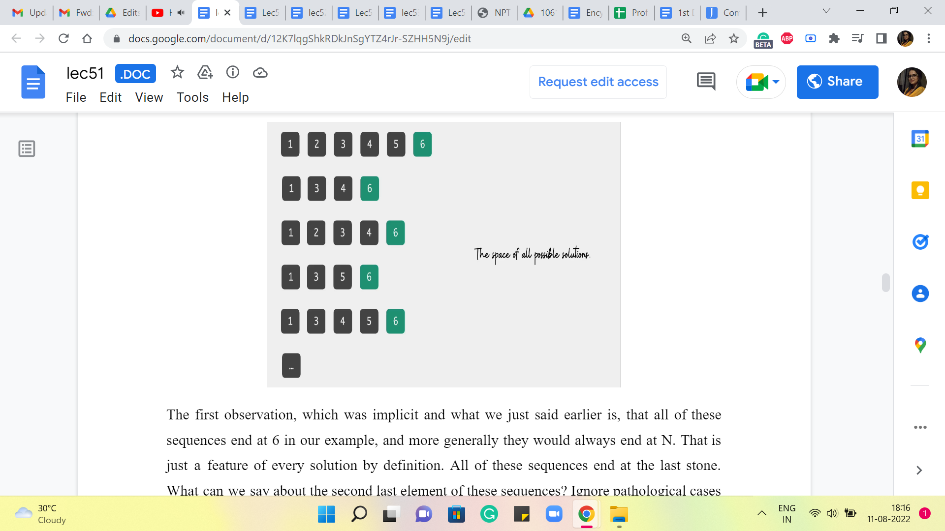 The first observation, which was implicit and what we just said earlier, is that all of these sequences end at 6 in our example, and more generally, they would always end at N. That is just a feature of every solution by definition. All of these sequences end at the last stone. What can we say about the second last element of these sequences? Ignore pathological cases like when N = 1. In fact, I think, it is promised in the problem constraints that N is at least 2.