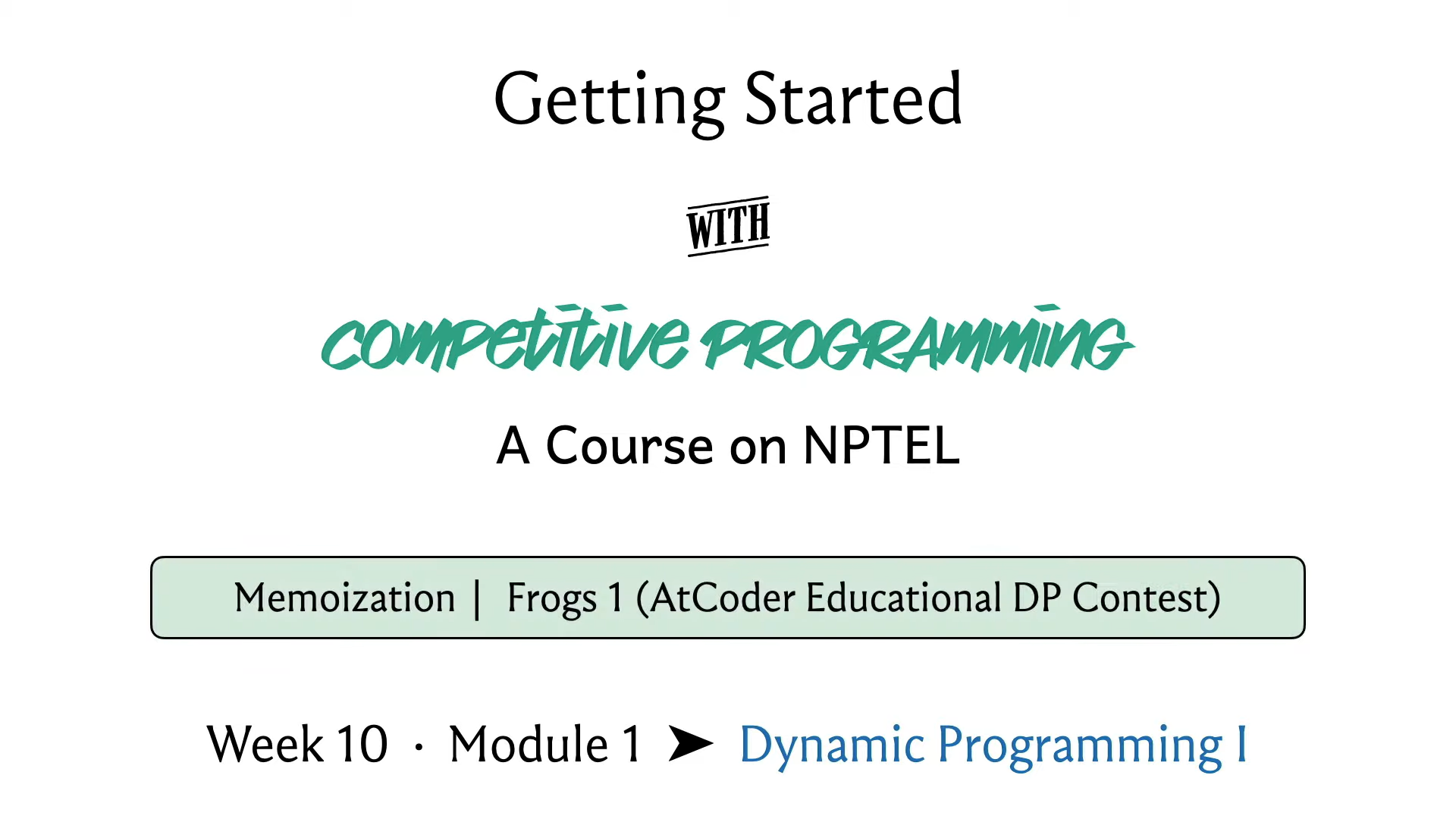 Hello and welcome to the first module in the 10th week of Getting Started with Competitive Programming. With the 10th week, we are starting a new theme in the course and this is going to be Dynamic Programming. It is a theme that we will continue to explore all the way till the end of the course, which is to say up to week 12.