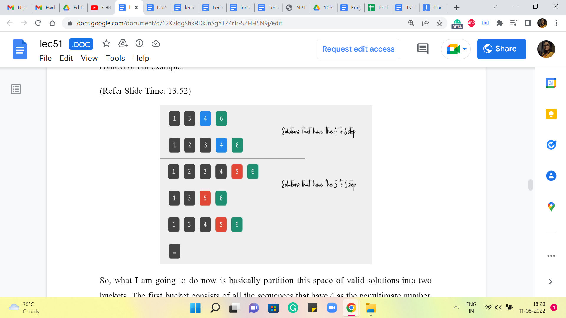 So, if you look at the second last element in these sequences, then it is always 5 or 4 in the context of our example. So, what I am going to do now is basically partition this space of valid solutions into two buckets. The first bucket consists of all the sequences that have 4 as the penultimate number. And the second bucket has all those sequences that have 5 as the penultimate number. Okay. So, more generally, you want to divide up your search space into 2 collections. In the first collection, you look at all those sequences where the last hop happened from stone number N-2. So, it was a skip over stone number N-1 to get to the last stone.